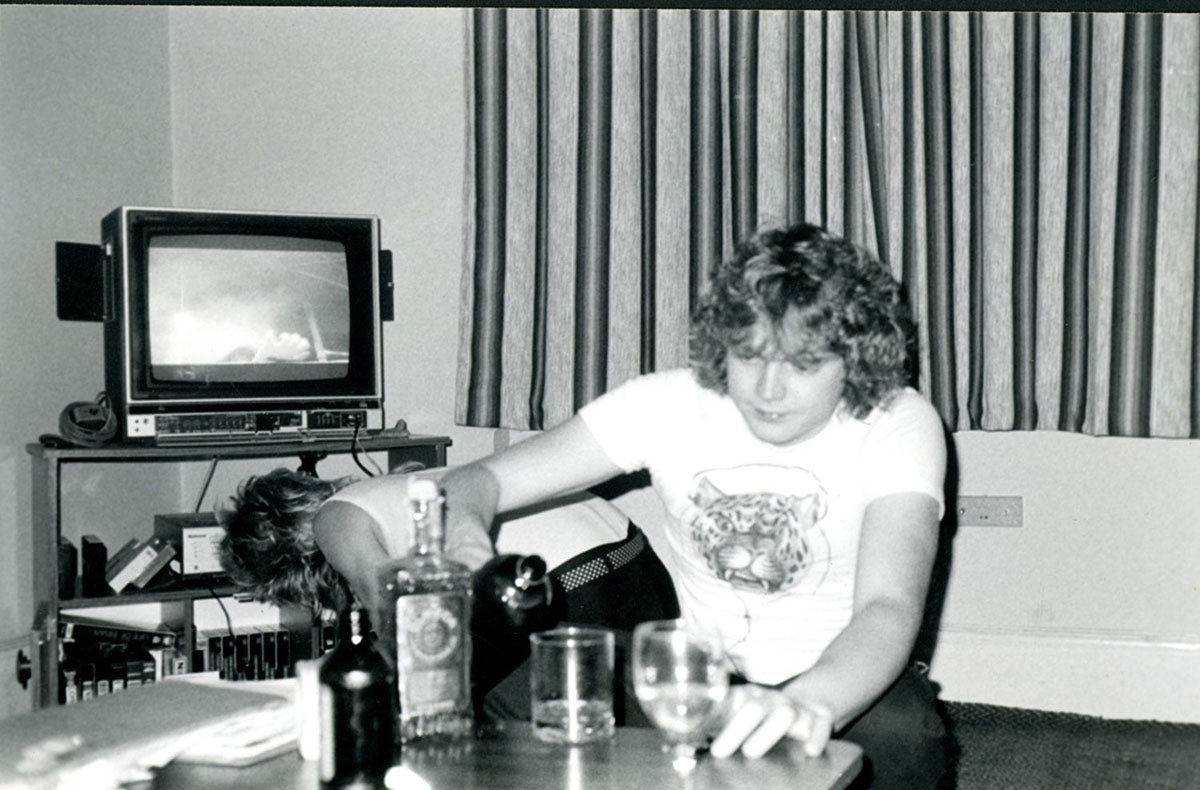 It's Booterstown Band House cocktail hour for Rick Allen, circa 1984 in Dublin. Steve Clark searches through tapes, bending down just behind him. The band had a studio in the back of the house for writing and rehearsing Hysteria. Courtesy of the Lorelei Shellist Private Collection.