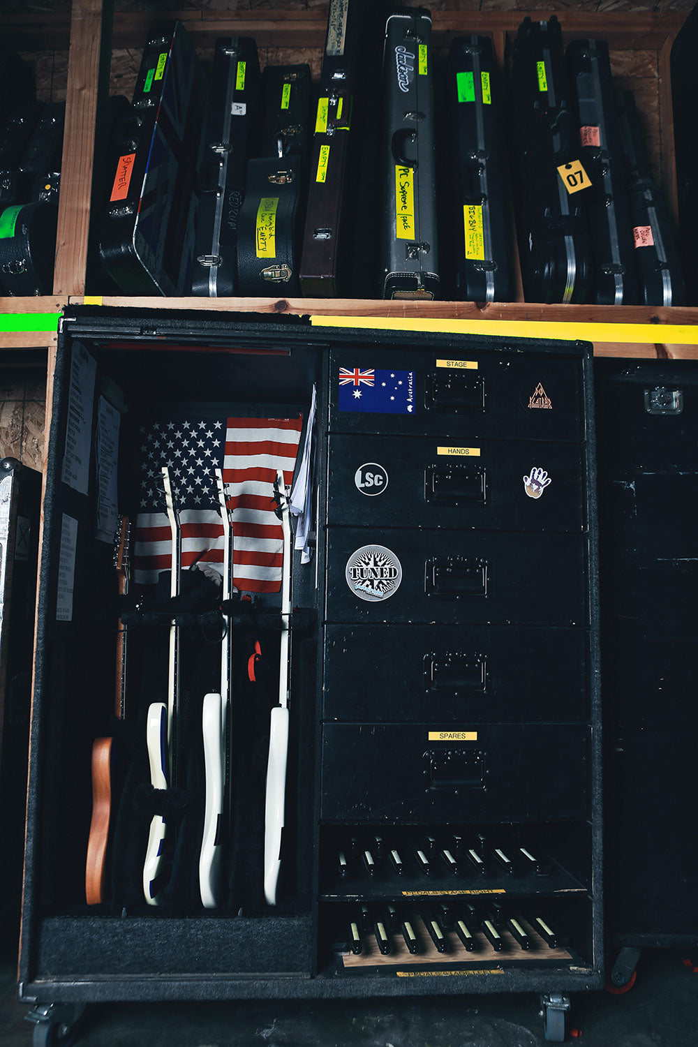 This is how the instruments travel on the road. Drawers contain strings, picks, spare parts, drink holders and cables. Below them are Sav’s Roland Midi pedals, used for all of the sub bass and synth string parts that he plays with his feet. Two, sometimes three sets are used depending on stage size.