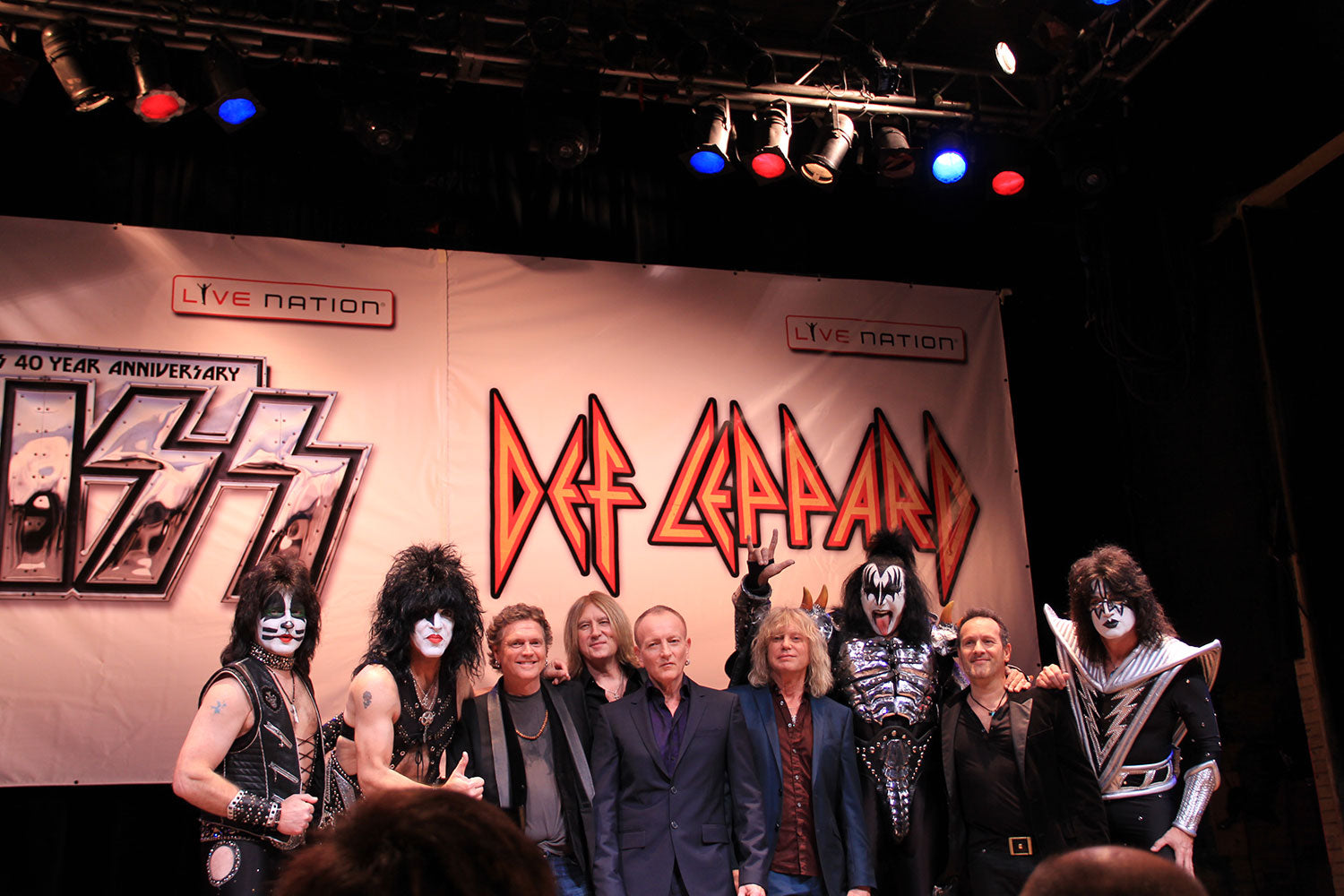 KISS and Def Leppard pose for a photo shoot after a livestreamed press junket and Q&A produced by Live Nation, March 2014. This event was in preparation for the KISS 40th Anniversary World Tour, which Def Leppard joined them on for the first 42 shows. Rick Allen, Phil Collen, Joe Elliott, Rick Savage, and Viv Campbell are the ones in the suitjackets. From the collection of Phil Collen.