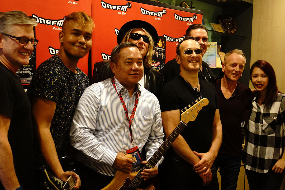 In November of 2015 Joe Elliott, Phil Collen, and Vivian Campbell visited 91.3 FM Radio in support of the band's stop at the Suntec Singapore Convention and Exhibition Centre. After the on-air interview, the boys held a press conference and took photos with radio station staff. From the collection of Phil Collen.