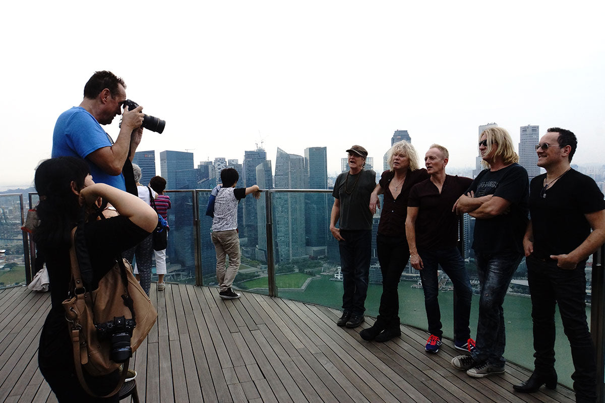 Rick Allen, Rick Savage, Phil Collen, Joe Elliott, and Vivian Campbell pose for press photos overlooking the beautiful Singapore skyline in support of their stop at the Suntec Singapore Convention and Exhibition Centre, November 2015. From the collection of Phil Collen.