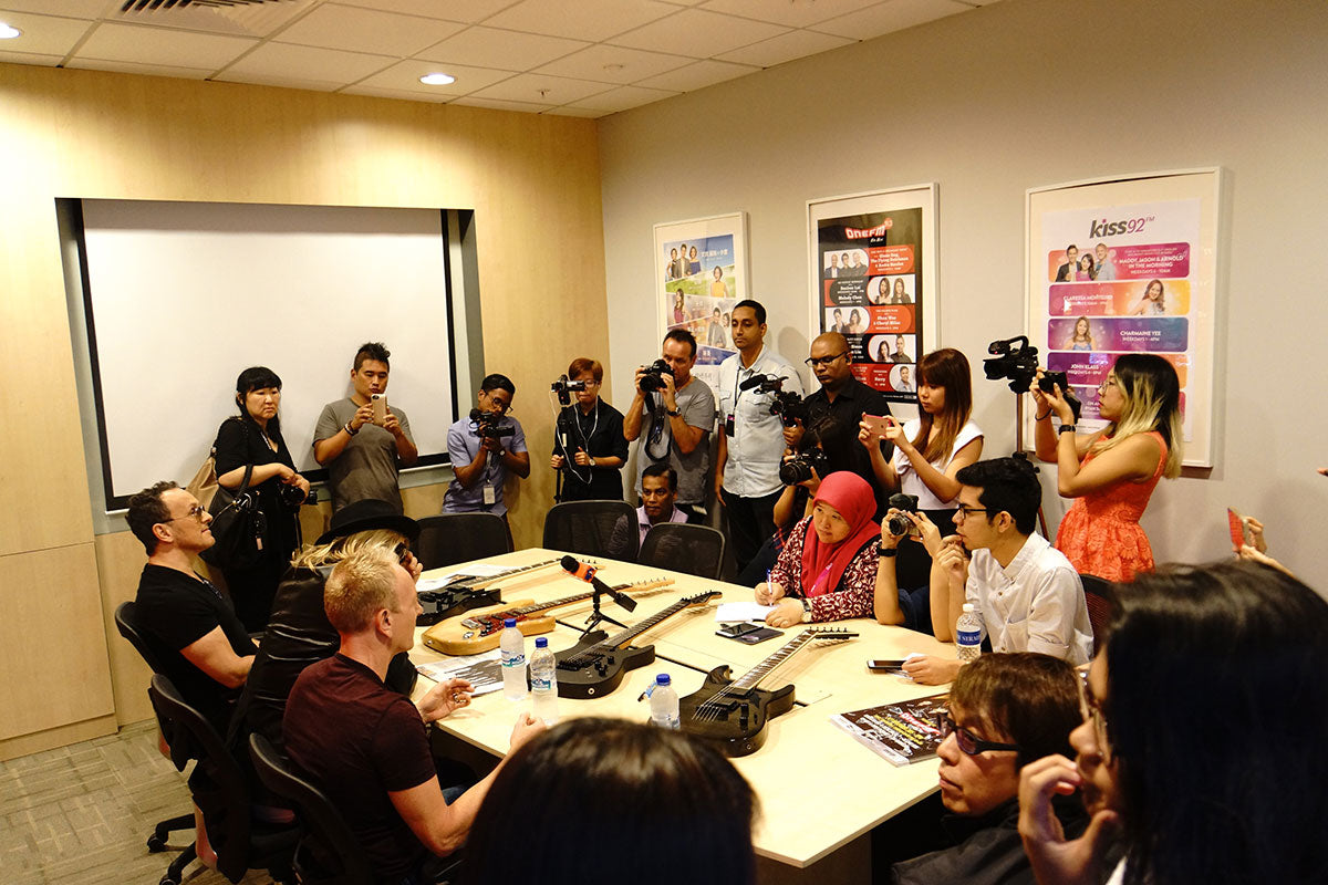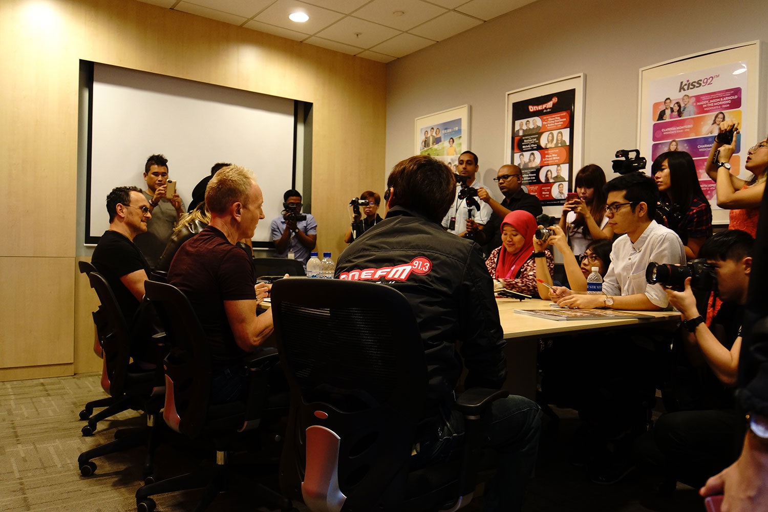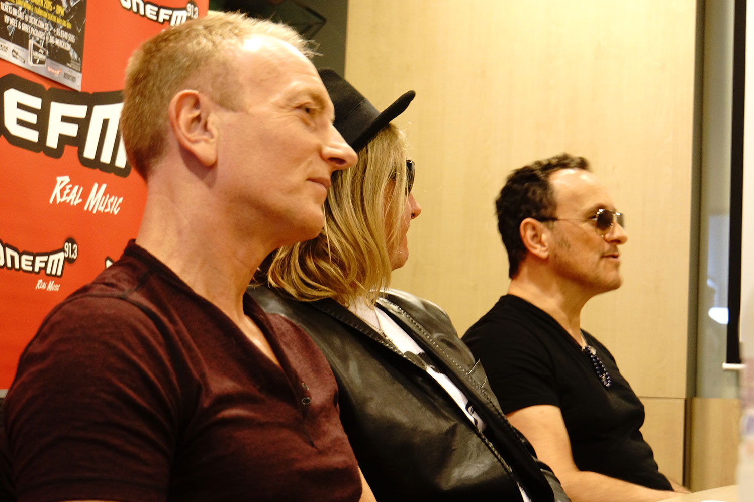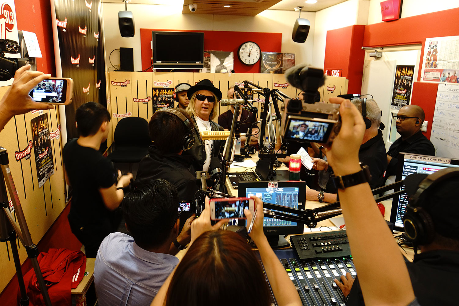 In November of 2015 Joe Elliott, Phil Collen, and Vivian Campbell visited 91.3 FM Radio in support of the band's stop at the Suntec Singapore Convention and Exhibition Centre. After the on-air interview, the boys moved into another room for a quick press conference. From the collection of Phil Collen.