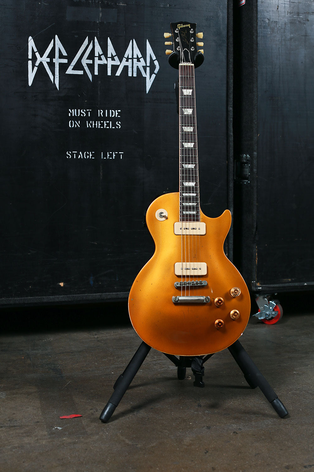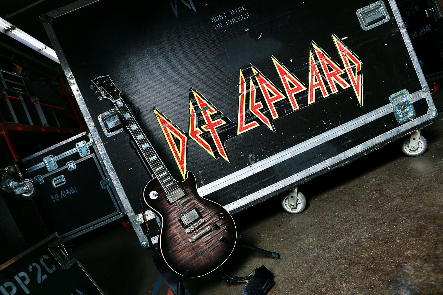 The Gold Top Gibson Les Paul is “Cait,” named after Vivian’s wife. This guitar sounds slightly different to others due to its pickups. “Cait" is played every night when on tour, primarily used in “Love Bites.” Pete Townshend carved his name into the back of this guitar when Def Leppard played a few shows with The Who in South America several years ago.
