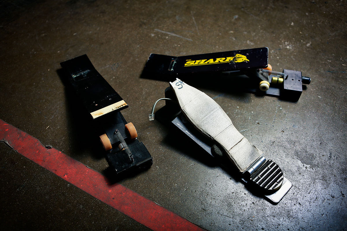Some of the earliest foot pedals Rick used were the Shark pedals. The pedals were spring loaded but didn’t offer a lot of finesse. The trigger in the middle is a customized piece, notable for it’s use of from instead of a spring. Rick found that with springs you would often get a lot of bounce out of the pedal which could result in a “double trigger” or extra drum hits.