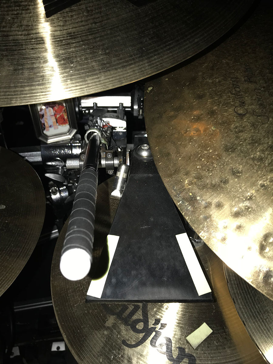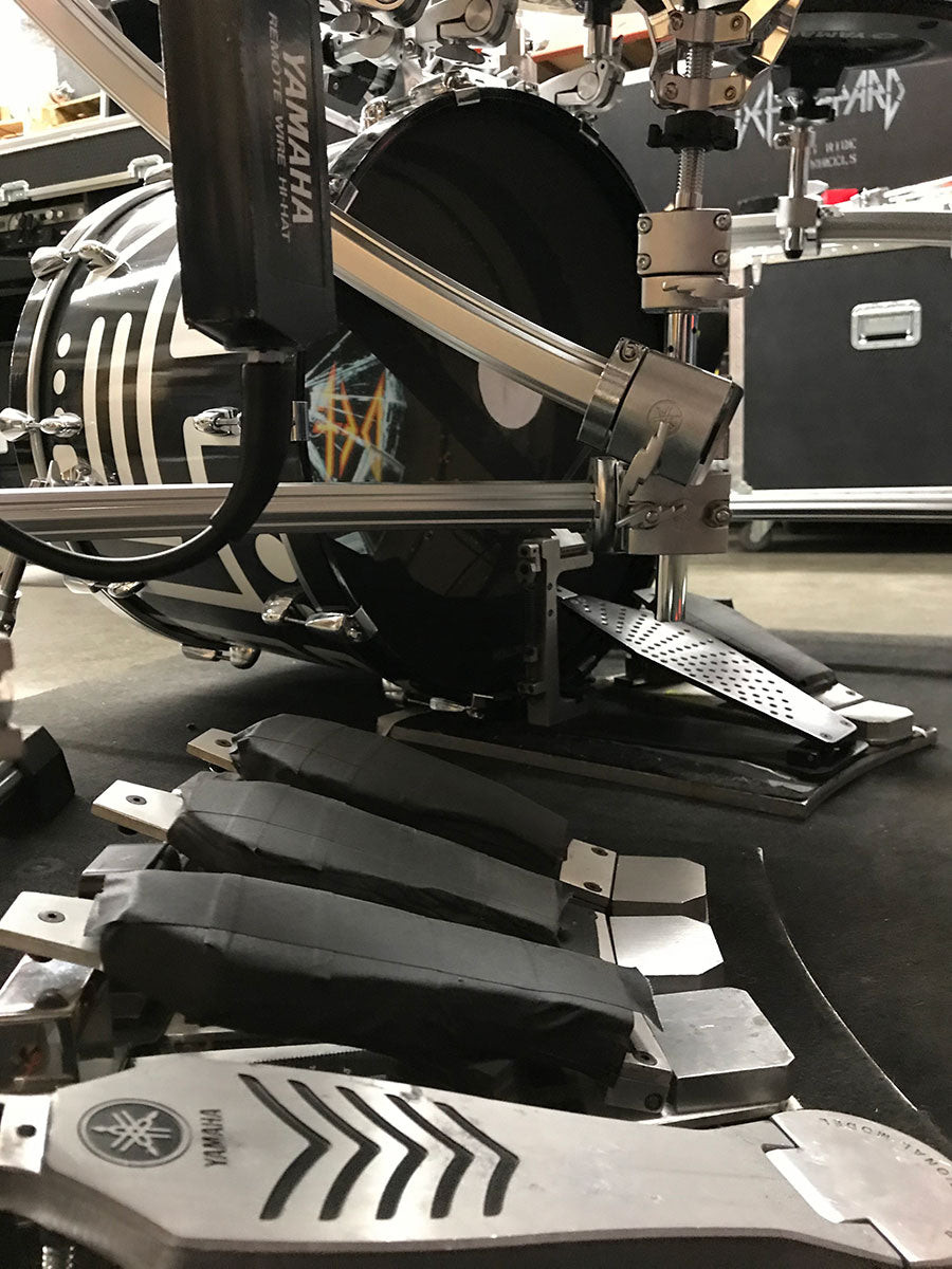 Close ups of the foot trigger pedals. A staple of Rick’s kits for over a decade, these AXIS made pedals feature some of the shockingly simplest of designs. The pads on top are literal Dr Scholls shoe inserts and black gaffer tape. Instead of a spring, a small stack of neoprene pads pops the pedal backup but doesn’t add extra bounce. The pedals are a perfect example of “it it ain’t broke, don’t fix it”