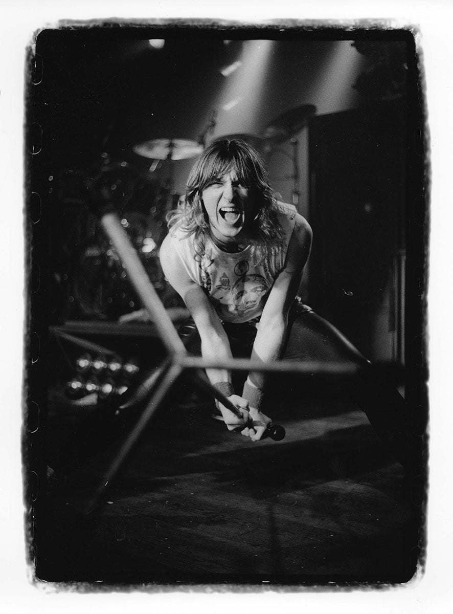 Rick Savage mugs it up at the Booterstown band house in Dublin where the Lepps began writing Hysteria. This back room studio showcases several classic Def Leppard guitars, including Steve Clark's Dean Cadillac from High 'N' Dry and Pyromania. Sav is wearing a Pyromania tee with crosshairs logo by Andie Airfix. The shot is the perfect capture of a moment of uncertainty as the band tries to figure out where to go from Pyromania without just making "Pyromania II." Black and white photo. Courtesy of the Lorelei Shellist Private Collection.