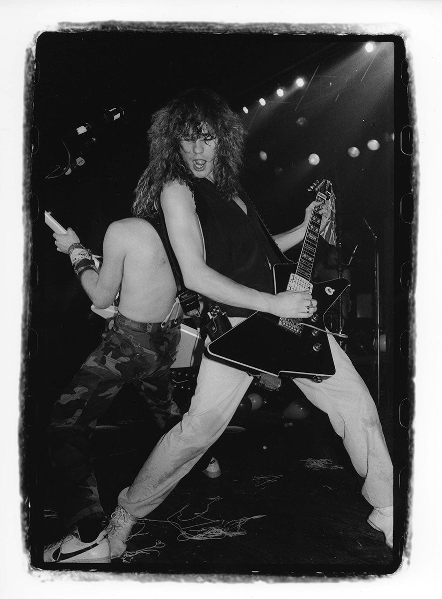 Steve Clark shares a laugh backstage with Bon Jovi's Richie Sambora at the Pacific Coliseum in Vancouver Canada, Hysteria Tour, 23 June, 1988. This was the final night of the Canadian leg of the tour, and to polish it off, Jon Bon Jovi performed as the special guest for the band's encore song "Travelin' Band." This color photo print captures a happy meeting between two of rock's great lead guitarists. Courtesy of the Lorelei Shellist Private Collection.