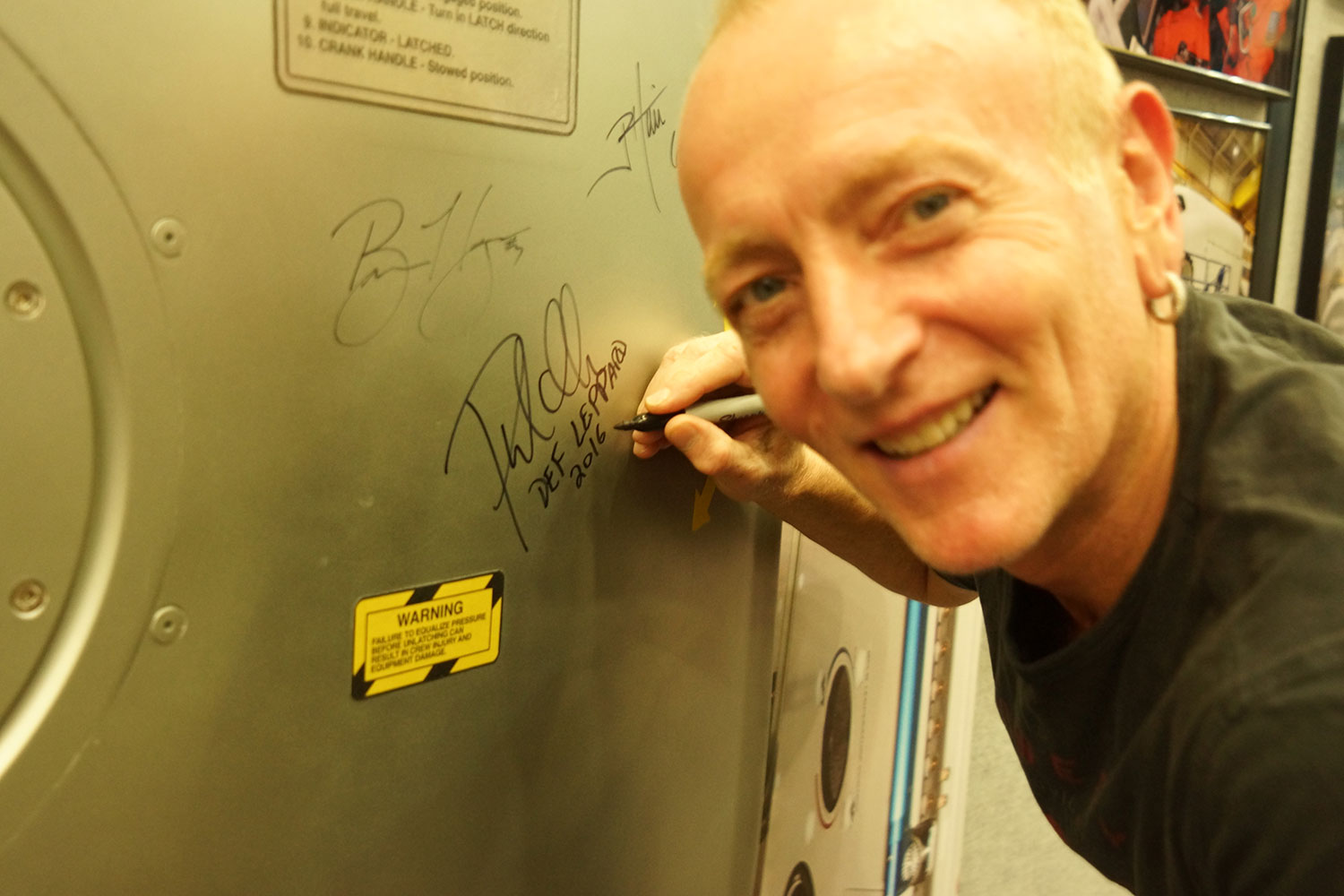 Phil signs the NASA wall of fame whilst on a guided tour at the Johnson Space Center in Houston, Texas, 22nd August, 2016. From the collection of Phil Collen.