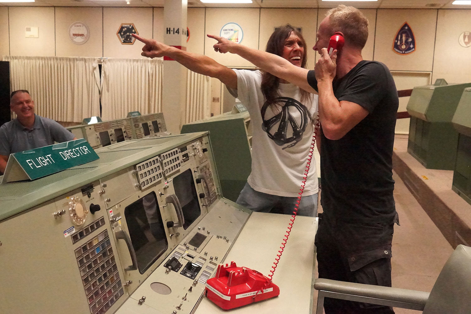 On the 22nd of August 2016, Phil Collen took a guided tour of NASA's Johnson Space Center in Houston, Texas. This day trip took place with members of Tesla who were touring with Def Leppard. Later that night, they would all perform at the Cynthia Woods Mitchell Pavillion. Here we see Phil fighting for power with Tesla's Jeff Keith at the Flight Director's Desk in the storied Apollo Mission Control Center. From the collection of Phil Collen.