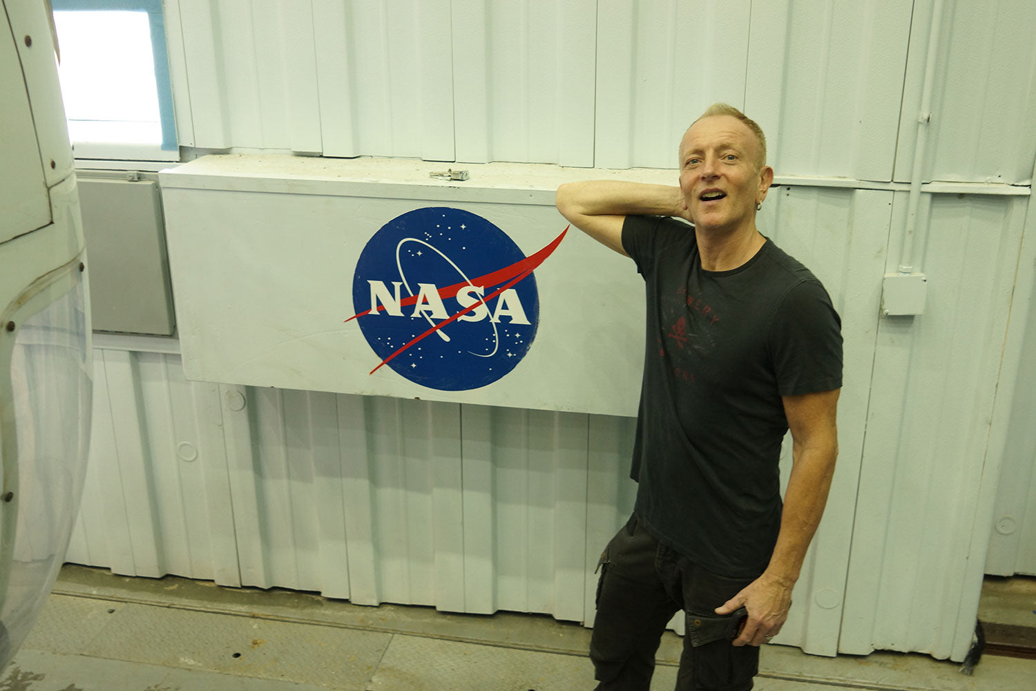 Phil Collen is pleased as punch, standing in front of the iconic NASA logo during his guided tour of NASA's Johnson Space Center in Houston, 22nd August, 2016. From the collection of Phil Collen.