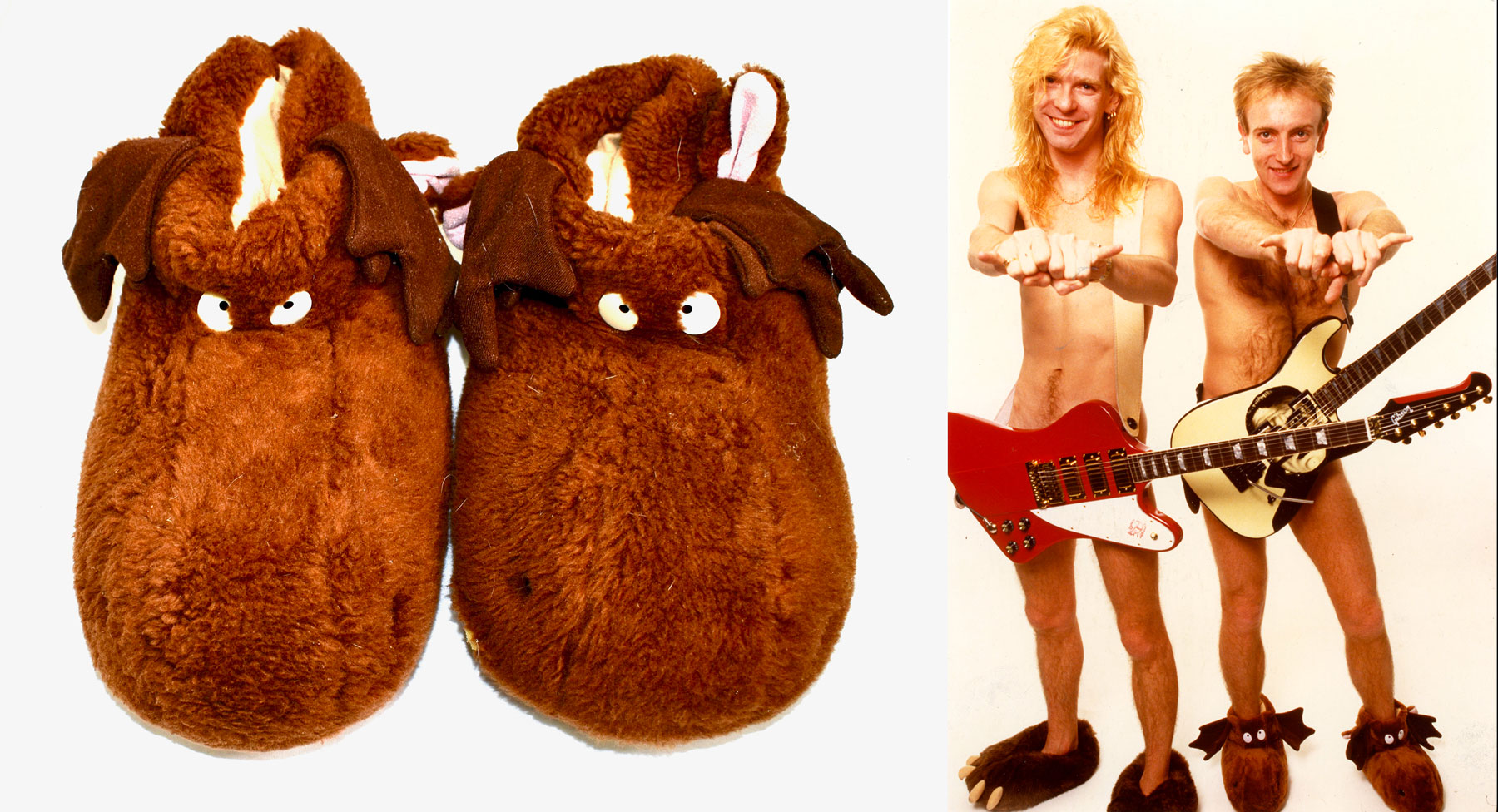 The moose and bear claw slippers exemplify Def Leppard's commitment to comfort and fashion, but it's Phil's classic Signature Jackson graced by a glow-in-the-dark image of Bela Lugosi that often stole the show. "Bela," according to Phil in a 2018 backstage interview with Jackson Guitar's YouTube channel, "has been on more magazine covers than I have". Slippers: From the Collection of Def Leppard. Photo: Courtesy of the Lorelei Shellist Private Collection.