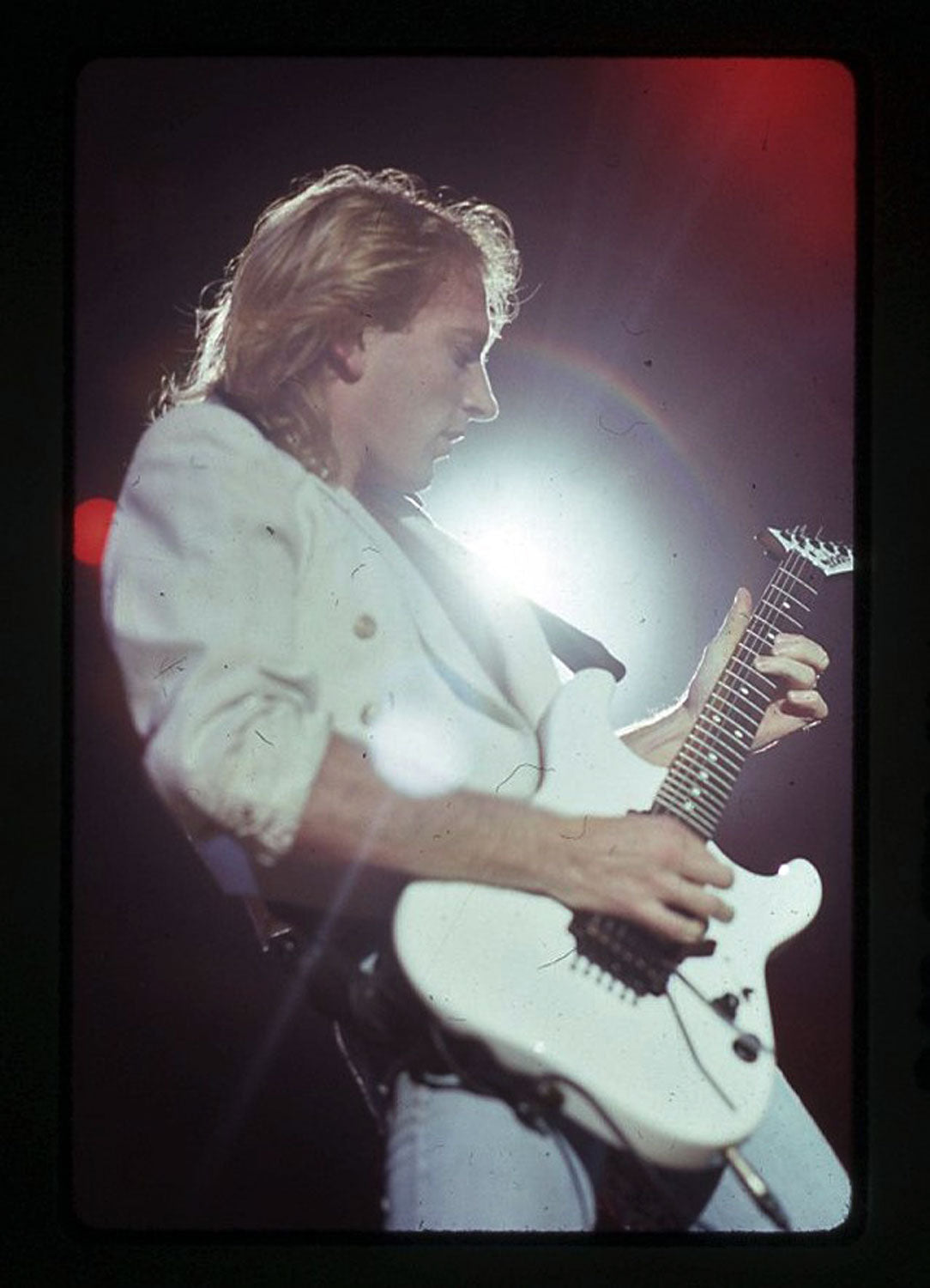 Phil finds some solitude with his Adrenalize Jackson PC1 in this photo captured during the "Seven Day Weekend" Tour, 1993. Photo: Ross Halfin. From the Collection of Def Leppard.