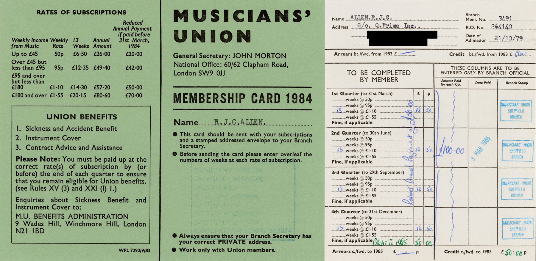 The boys were current on their dues according to this Musicians' Union Membership Card from 1984. The union's Sheffield Branch Secretary included a sticker on the tan envelope carrying the cards that reads "musicians' union says keep music live". From the Collection of Def Leppard.