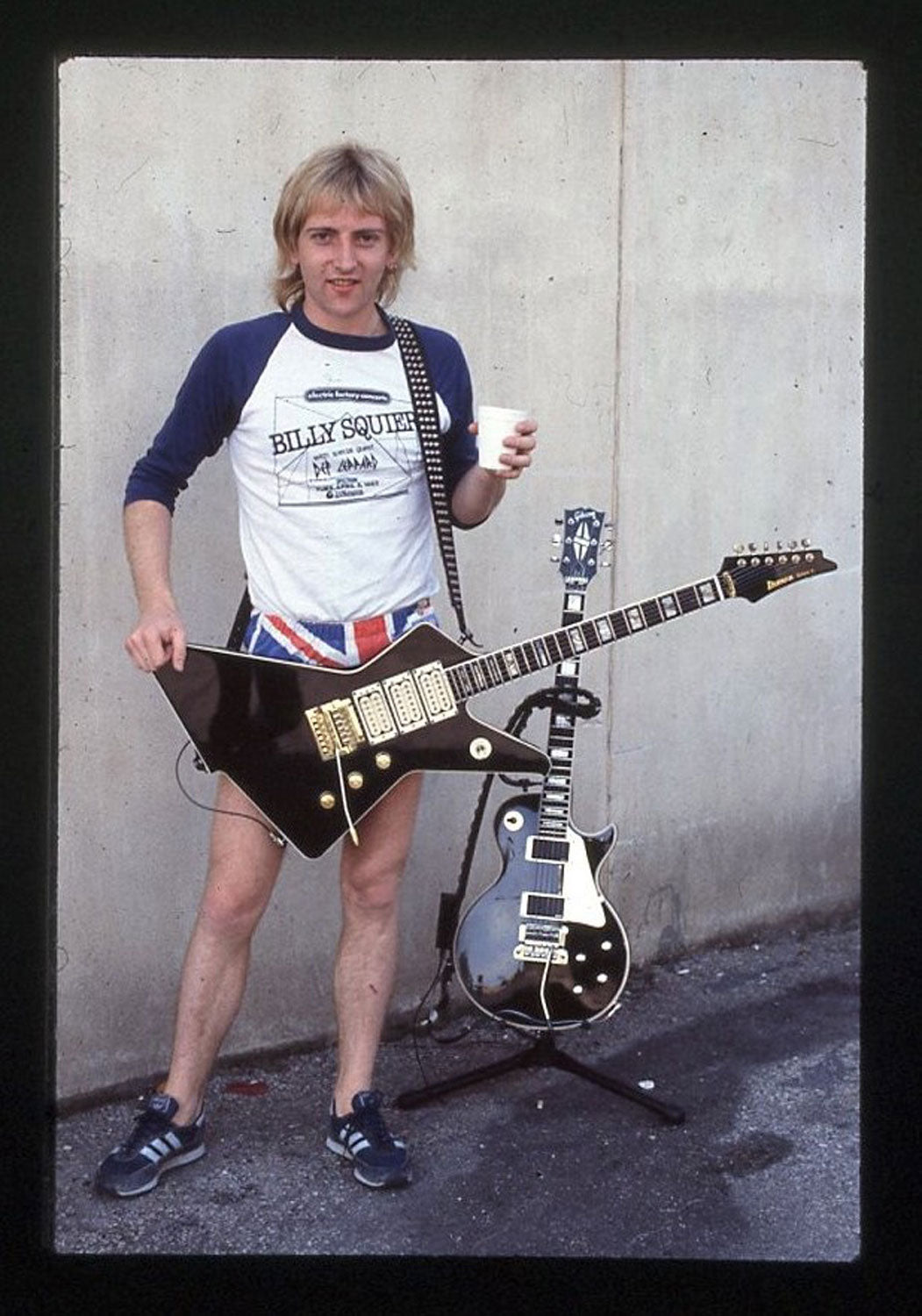 Phil wields his 1980 Ibanez Destroyer under the bright lights of the Pyromania Tour, circa 1983. "This one's famous. I had guitar companies copying this one, trying to entice me to use them. I received this in the post after I returned from the Girls Japanese tour in 1981. Soon it became my main guitar. I mean, it looked weird and was like a parallel universe version of the Gibson Explorer with a bit more flash...This guitar could do it all and take me through any kind of journey, and it did that very well right up until the end of the Pyromania Tour...You can hear this on the solos on "Photograph", "Foolin'", and "Rock of Ages" among others." From the Collection of Def Leppard.