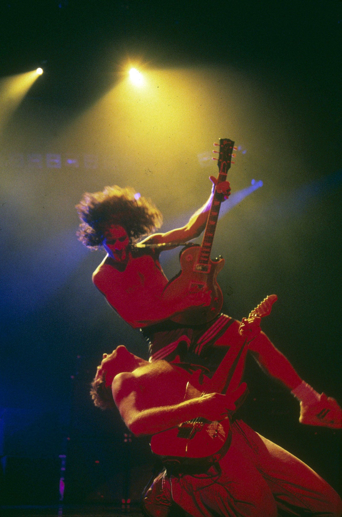 Viv lands an acrobatic riff as he makes way for Phil's epic kneeslide during the 1993 Slang Tour. Photo: Ross Halfin. From the Collection of Def Leppard.