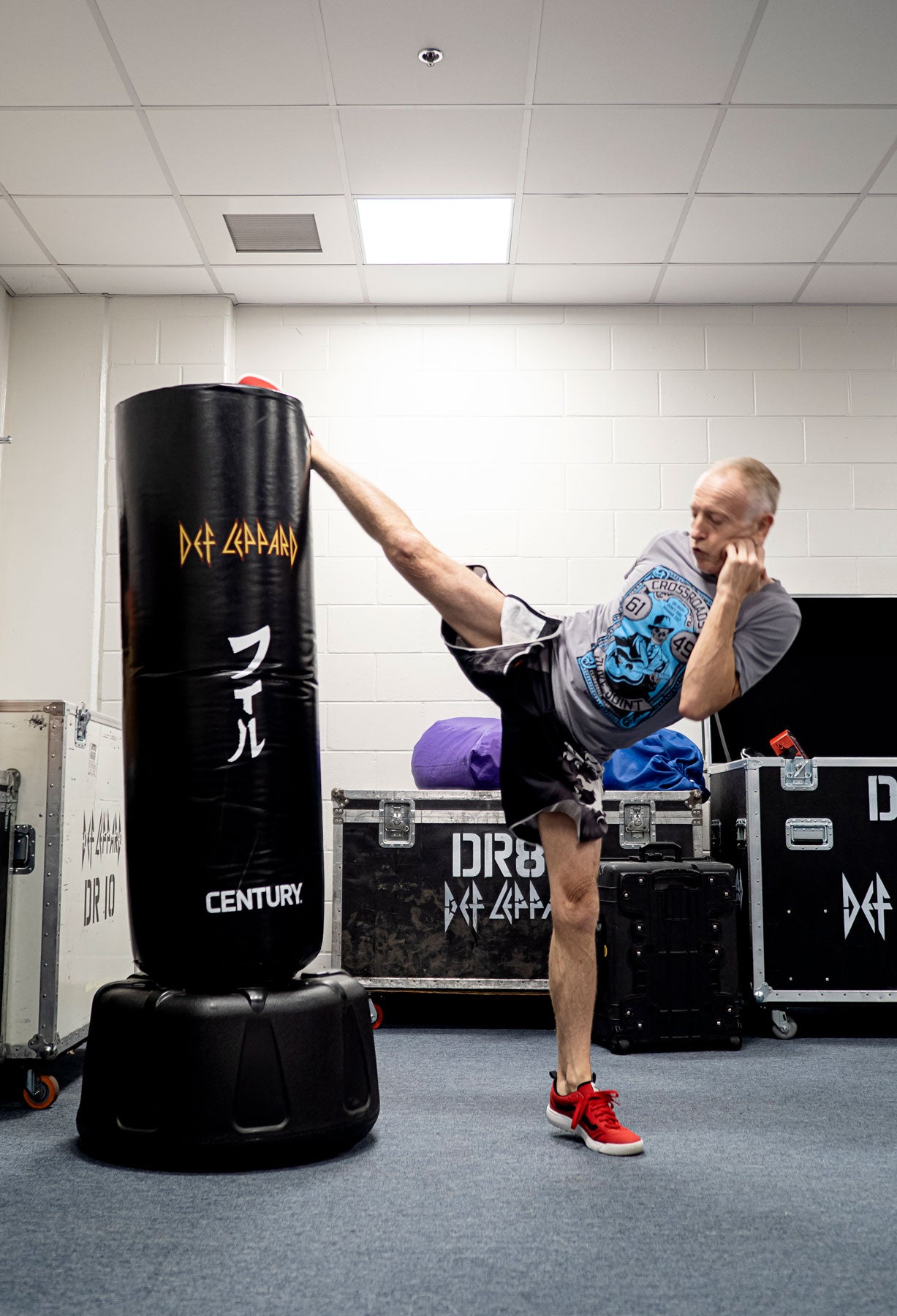 That's not practice drums you're hearing, it's Phil soloing on the portable heavy bag backstage. This pre-show workout happened backstage at Hard Rock Stadium, Miami Gardens, Florida, during the 2022 Stadium Tour. Photo: Ross Halfin. From the Collection of Def Leppard.