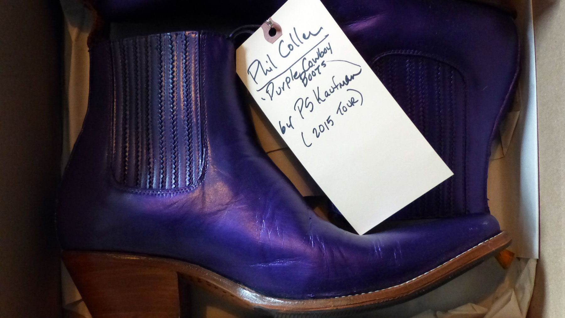 Phil's purple ankle cowboy boots by pskaufman..., worn on the Def Leppard World Tour, 2015. From the Collection of Phil Collen.