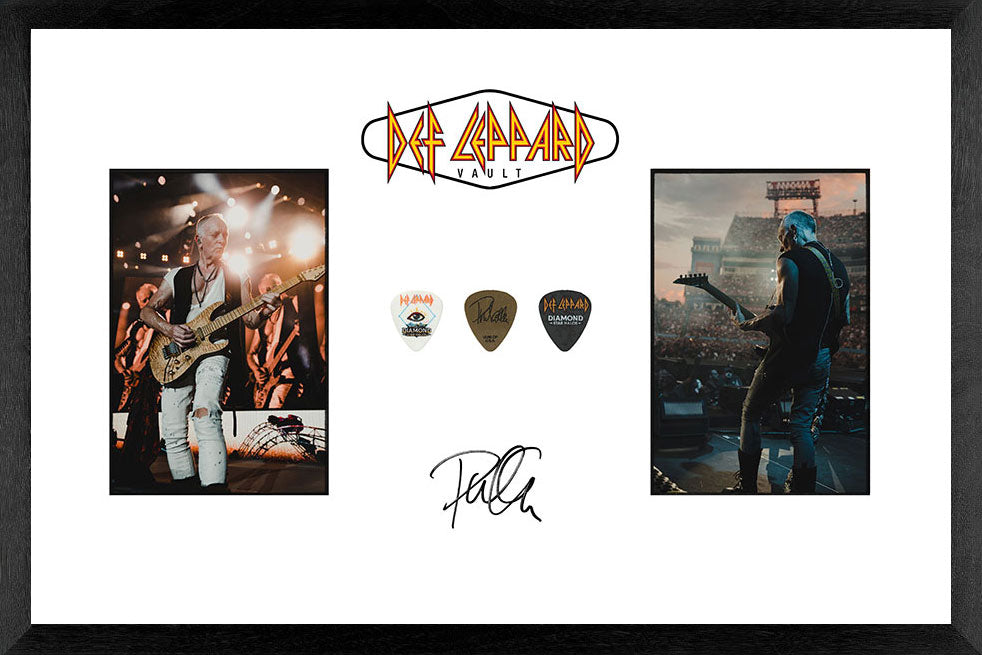 Celebrate the newest Leppard Vault collection honoring the one-and-only Phil Collen with this limited-edition signed Stadium Tour plectrum display. Own three of Phil's own personal plectrums: one signature design and two official Diamond Star Halos designs! (Specific plectrum designs may vary from display to display.)