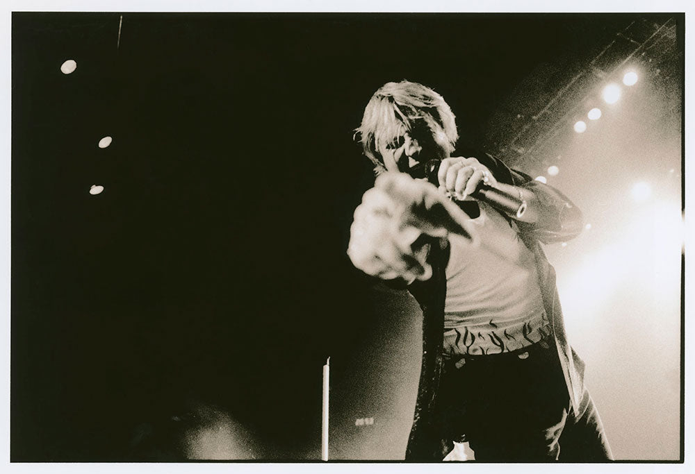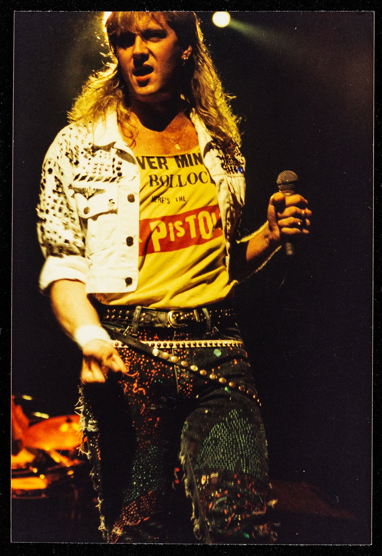 Joe wears a sleeveless Sex Pistols t-shirt and white studded jacket during a Hysteria Tour performance, 1987. Photo: Ross Halfin. From the Collection of Joe Elliott.