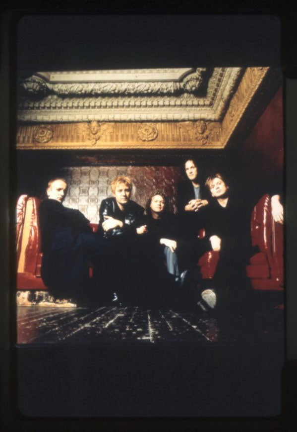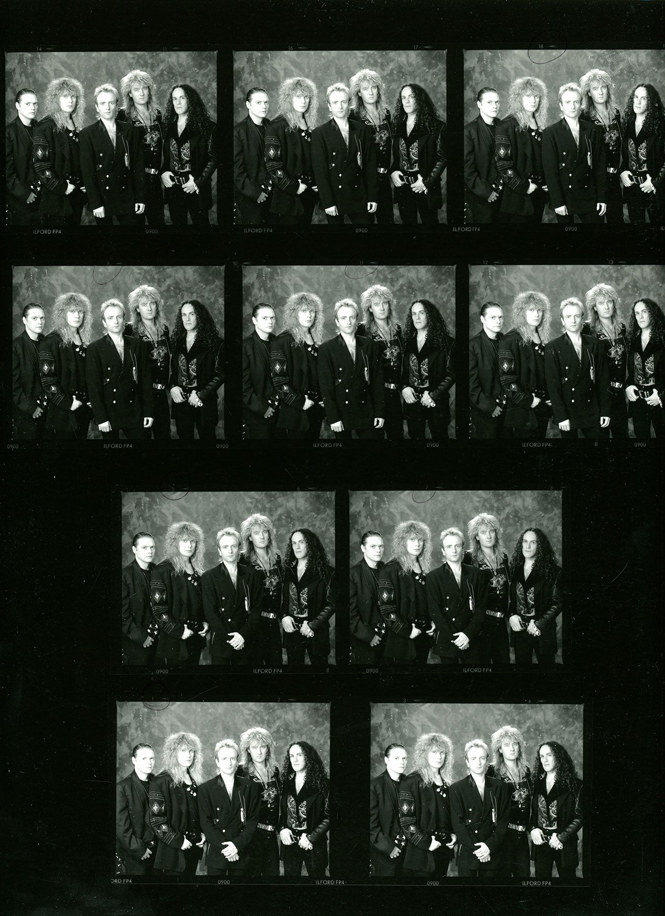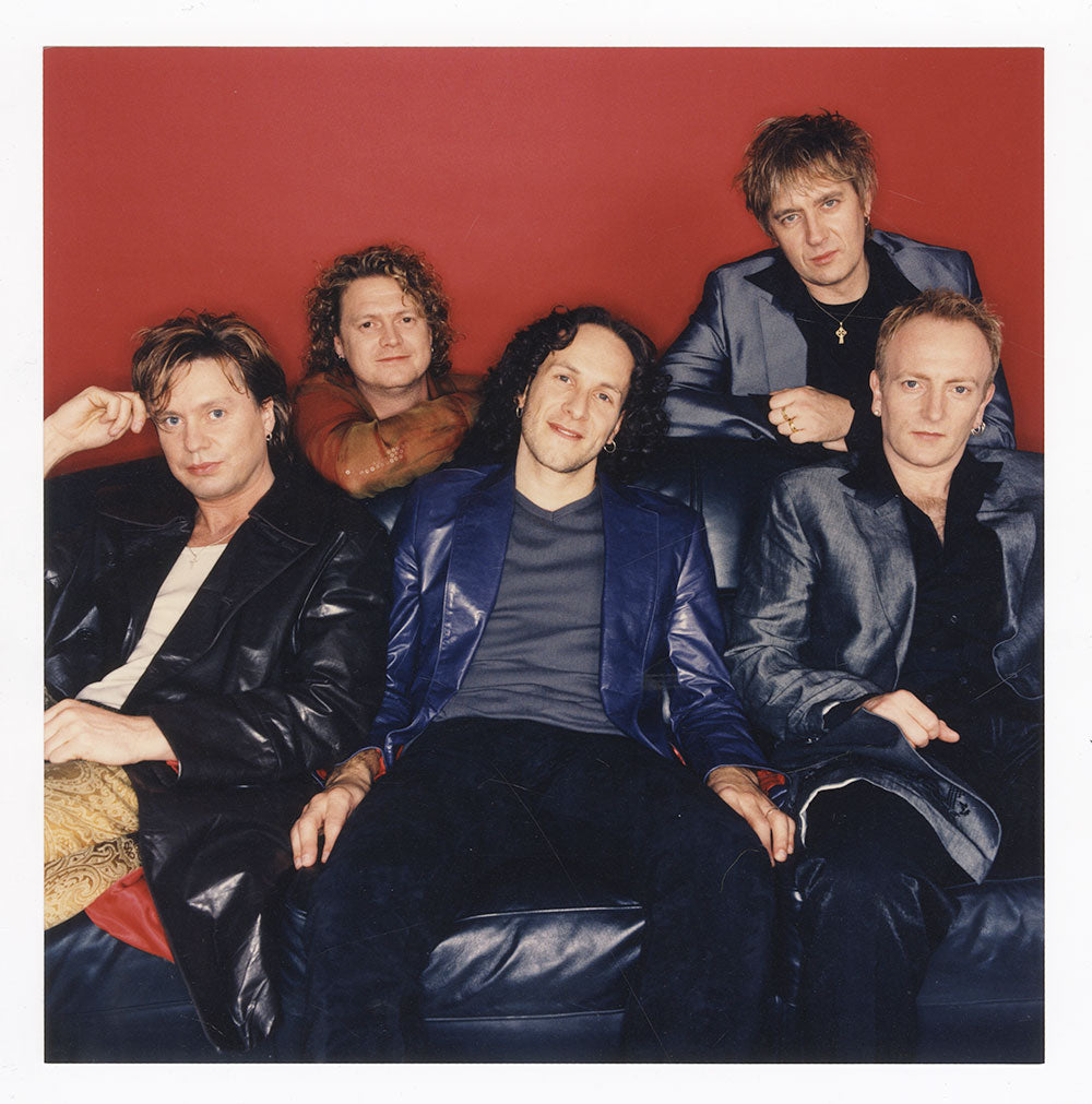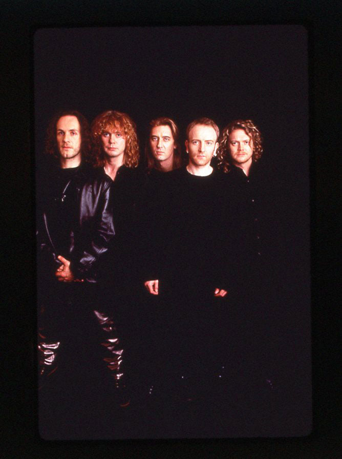 Outtake from a series of band portraits of Rick Savage, Rick Allen, Vivian Campbell, Joe Elliott, and Phil Collen taken during a Euphoria album art shoot, 1999. From the collection of Def Leppard.