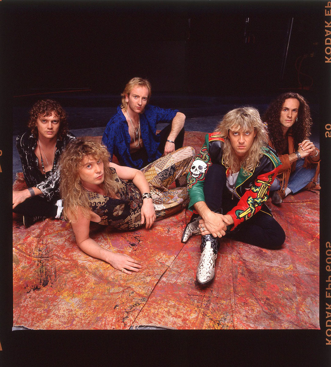 Rick, Sav, Phil, Joe, and Viv strike lounging poses in a portrait session in support of the Adrenalize Tour, 1992. Joe's leather jacket can also be seen in the Jackets Required section of the Vault. Photo: Ross Halfin. From the Collection of Def Leppard.
