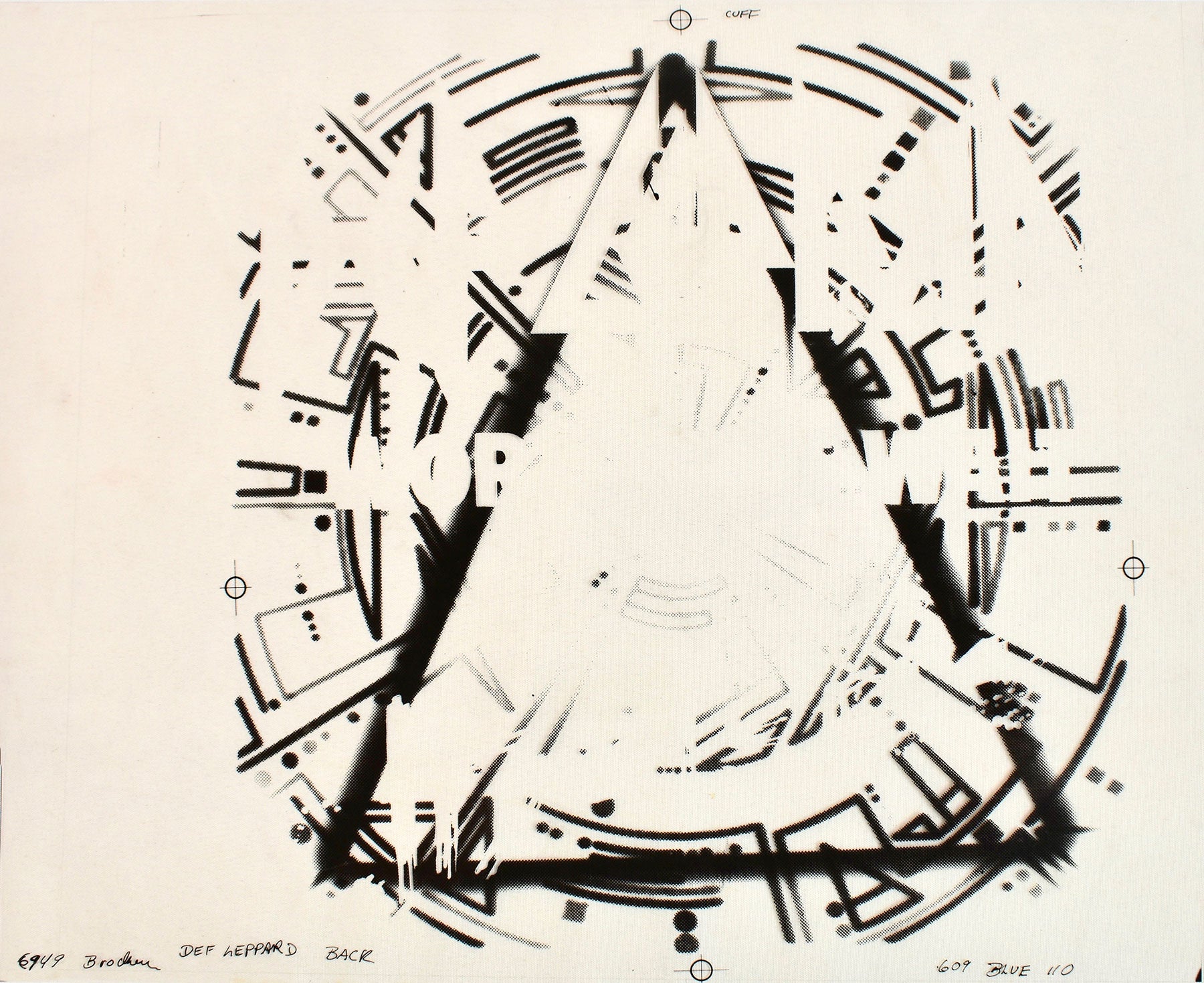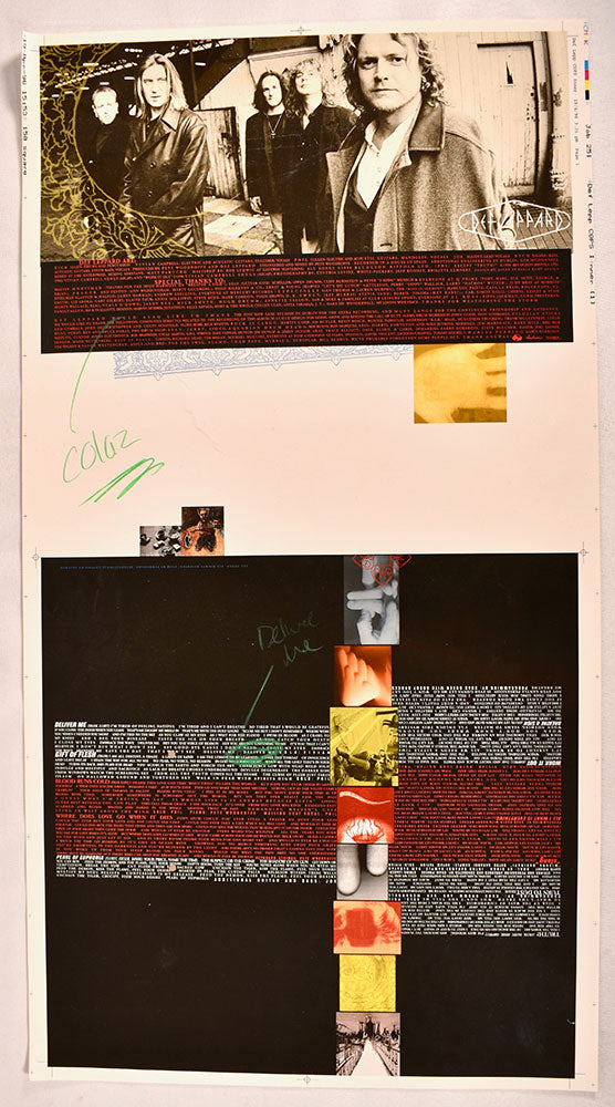 This colour proof dated 19th April, 1996 is only one of many steps in the design process of the Slang 12" LP art. The handwritten notes in green marker on this inner sleeve design would go back to the art department for correction. From the Collection of Def Leppard.
