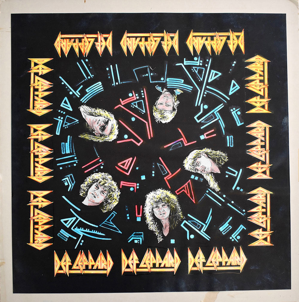 Hysteria collage art proof print featuring headshots of the band inside of Tron-style lines and Def Leppard logos. From the Collection of Def Leppard.