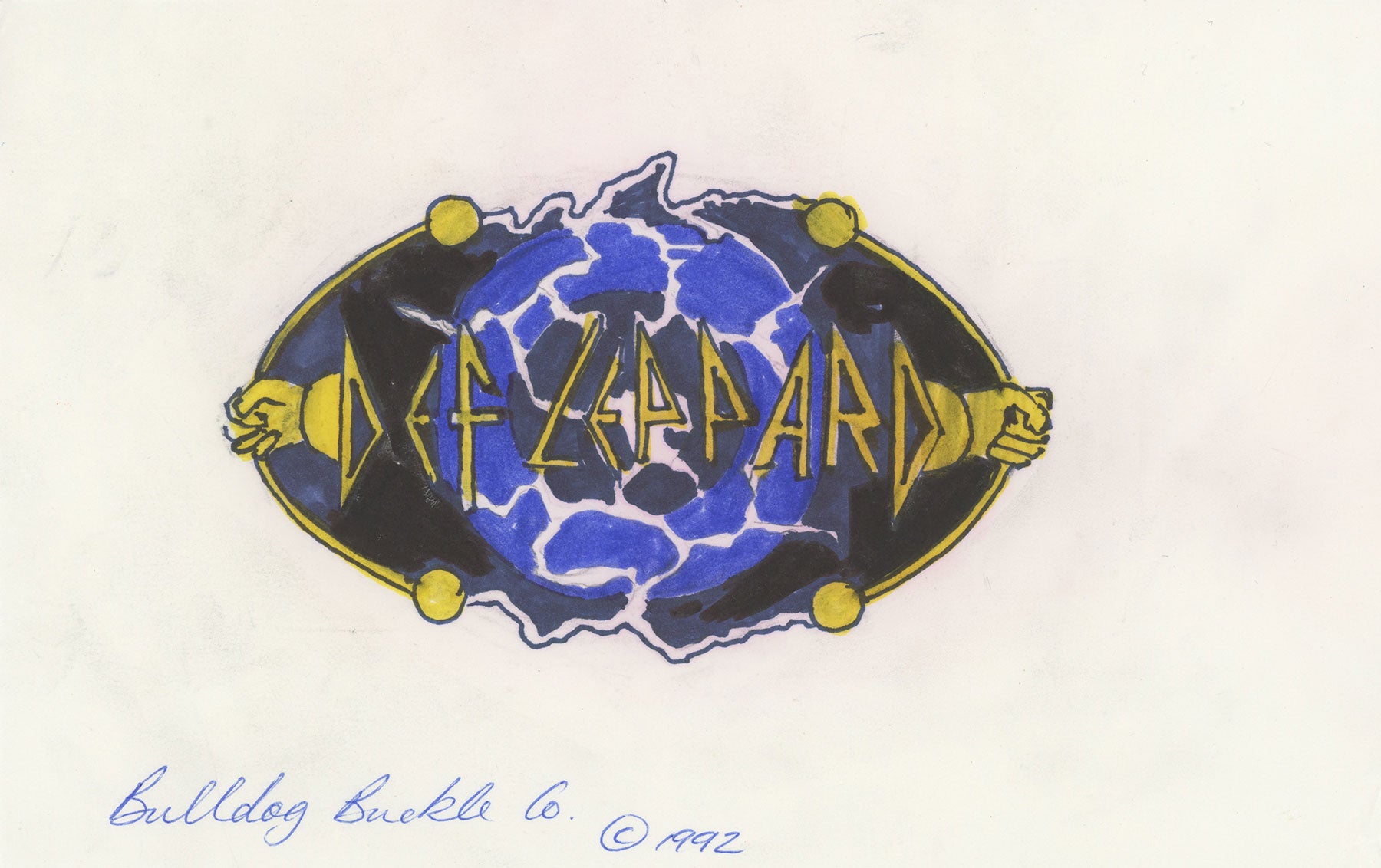 Early photocopy of a Def Leppard logo draft designed by artist Dave Jeffrey, 1978. Jeffrey recalls that this was "a preliminary sketch before the final artwork" that would be used on the Def Leppard EP. As to the final design's direction, Jeffrey says, "I remember considering that the leopard needed to be more adult and aggressive, as against the 'pussycat' look in the sketch." From the Collection of Joe Elliott.
