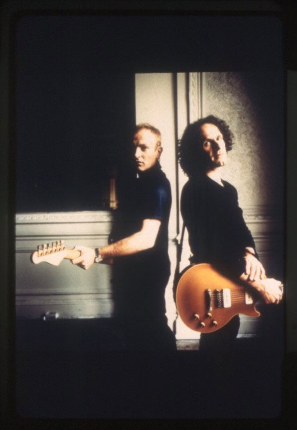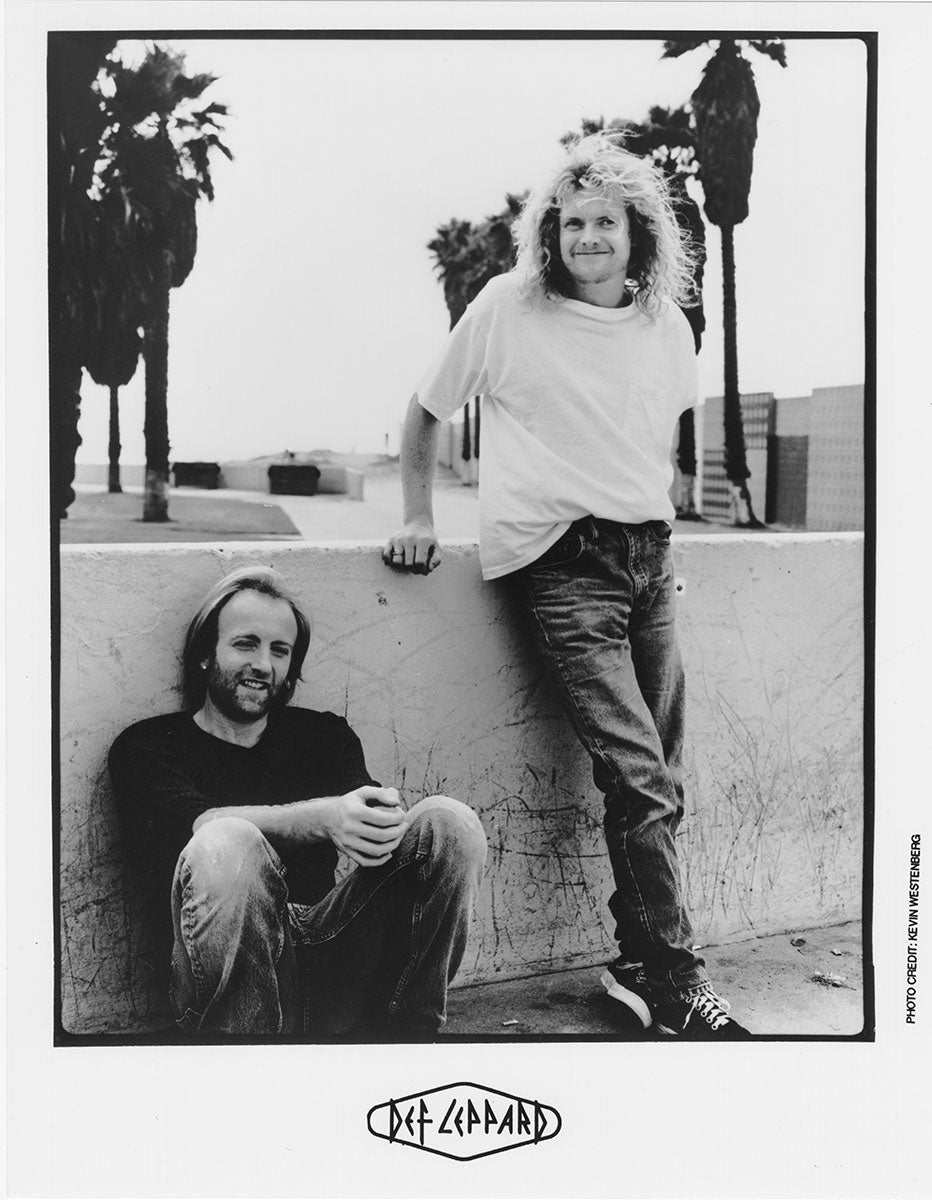 Phil and Rick sit in the L.A. summer sun during this Slang promotional shoot. The band did their pre-tour rehearsing in Los Angeles before kicking things off with a radio broadcast event on the UCLA campus. Photo: Kevin Westenberg. From the Collection of Def Leppard.