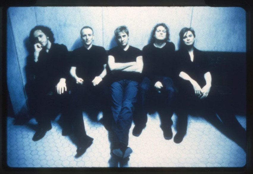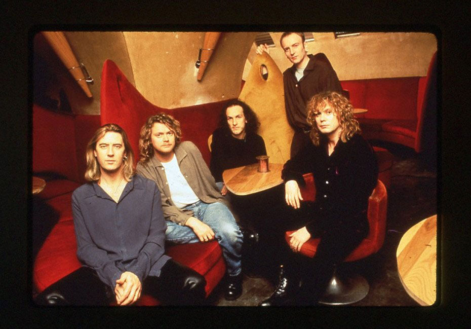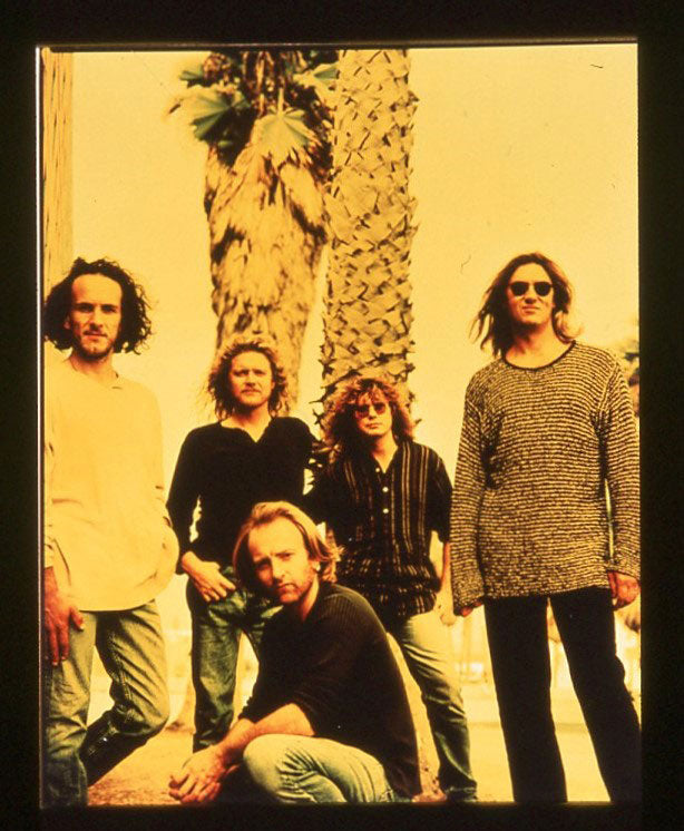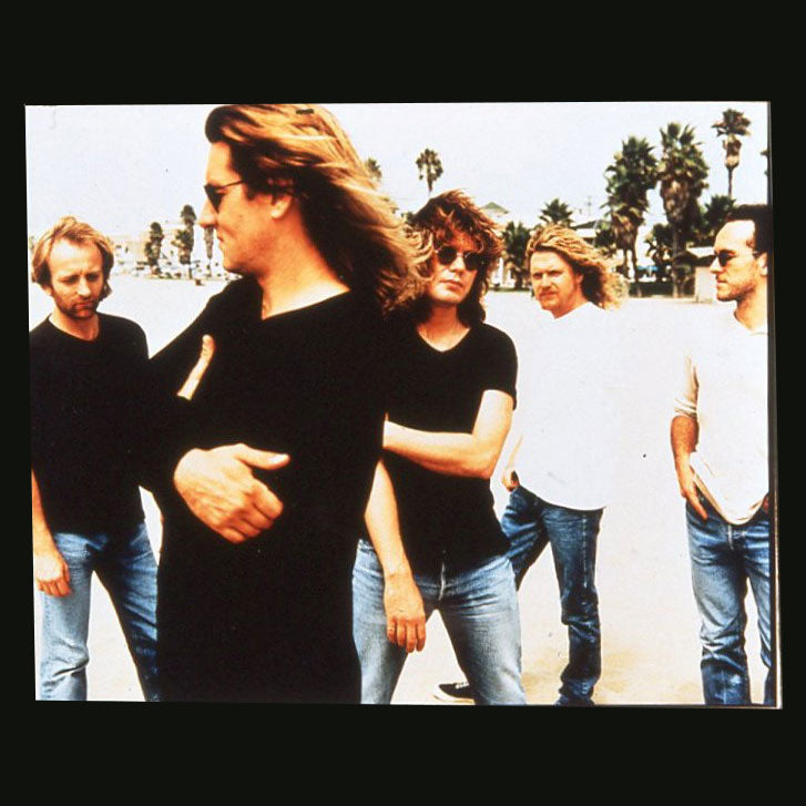 A promo band portrait captured at a Los Angeles beach, 1996, just before the start of the Slang Tour. Photo: Kevin Westenberg. From the Collection of Def Leppard.