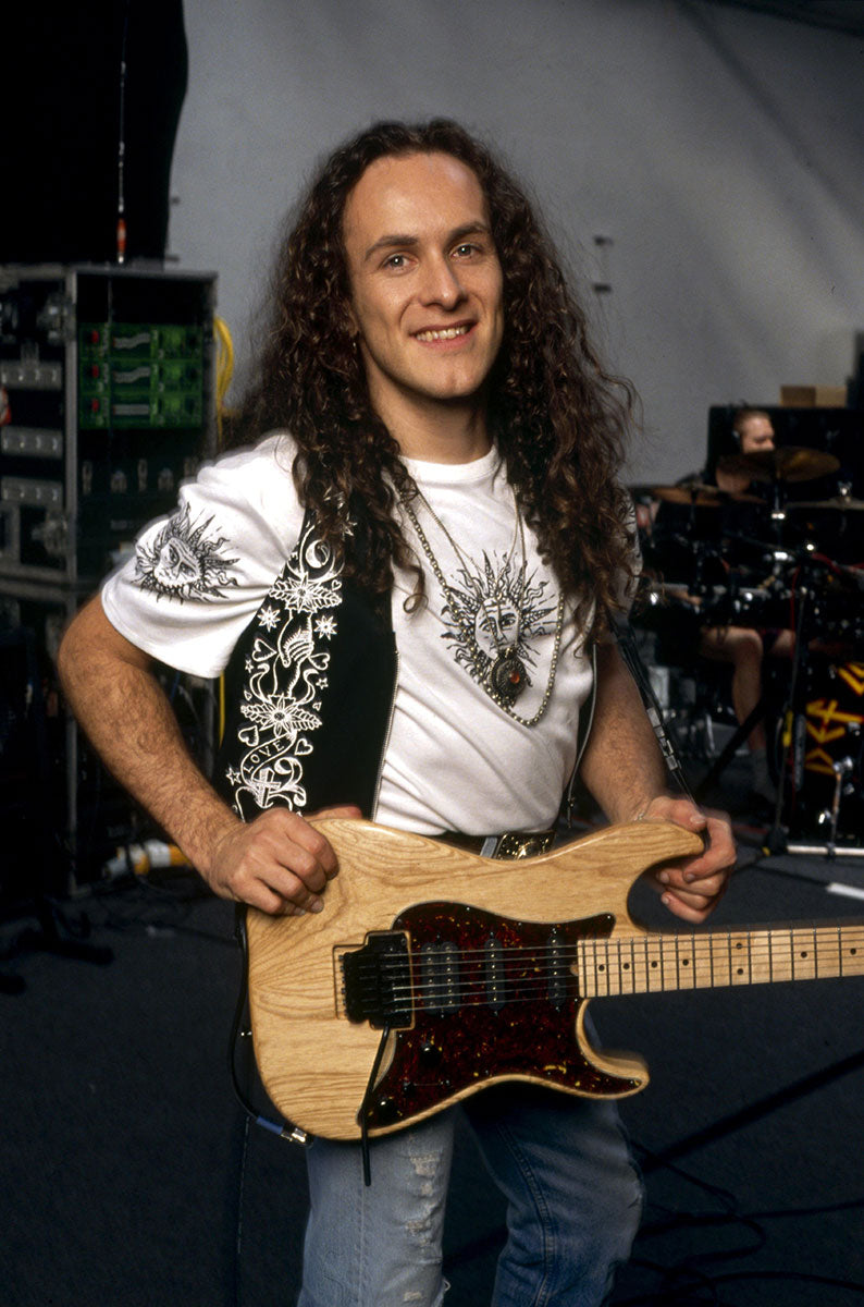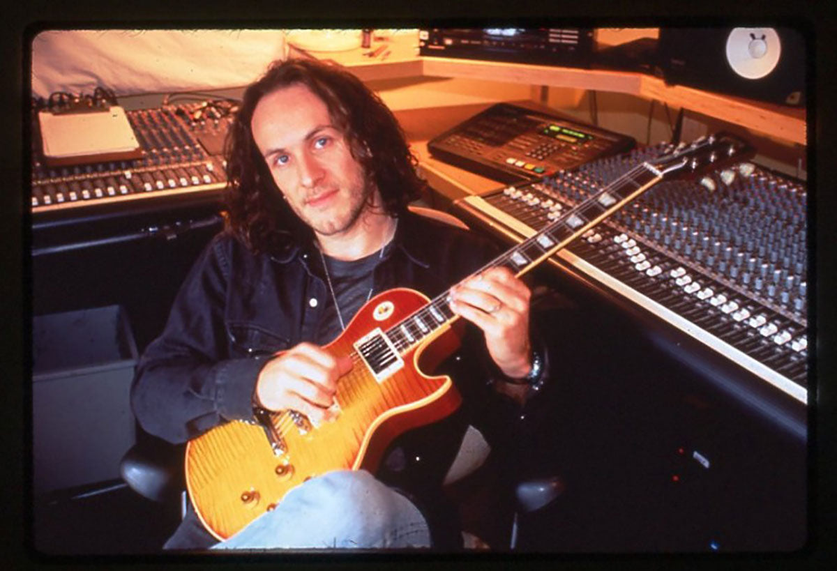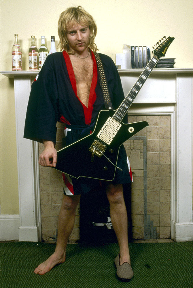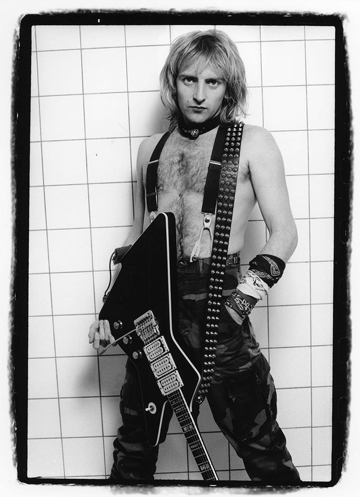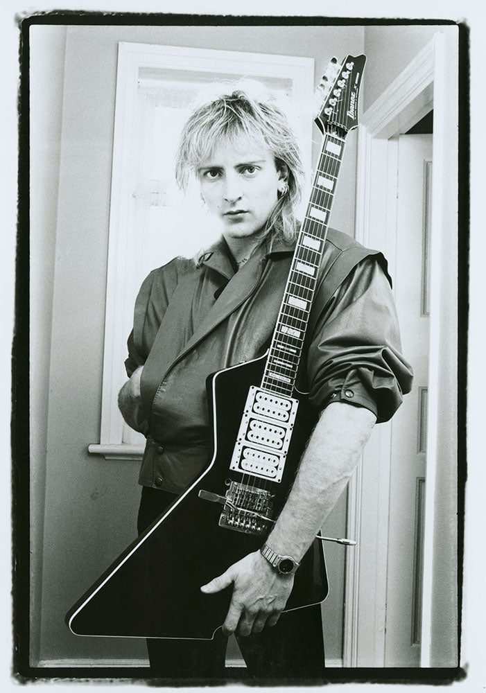Viv holds his Gibson Les Paul in this Adrenalize tour photo shoot, 1992. From the Collection of Def Leppard.