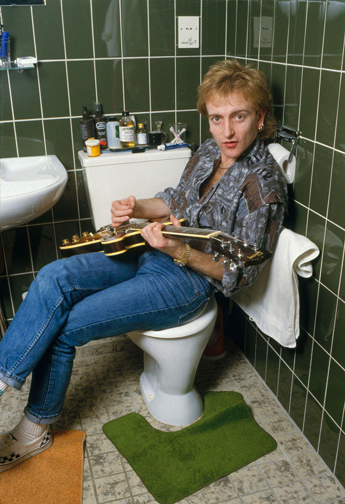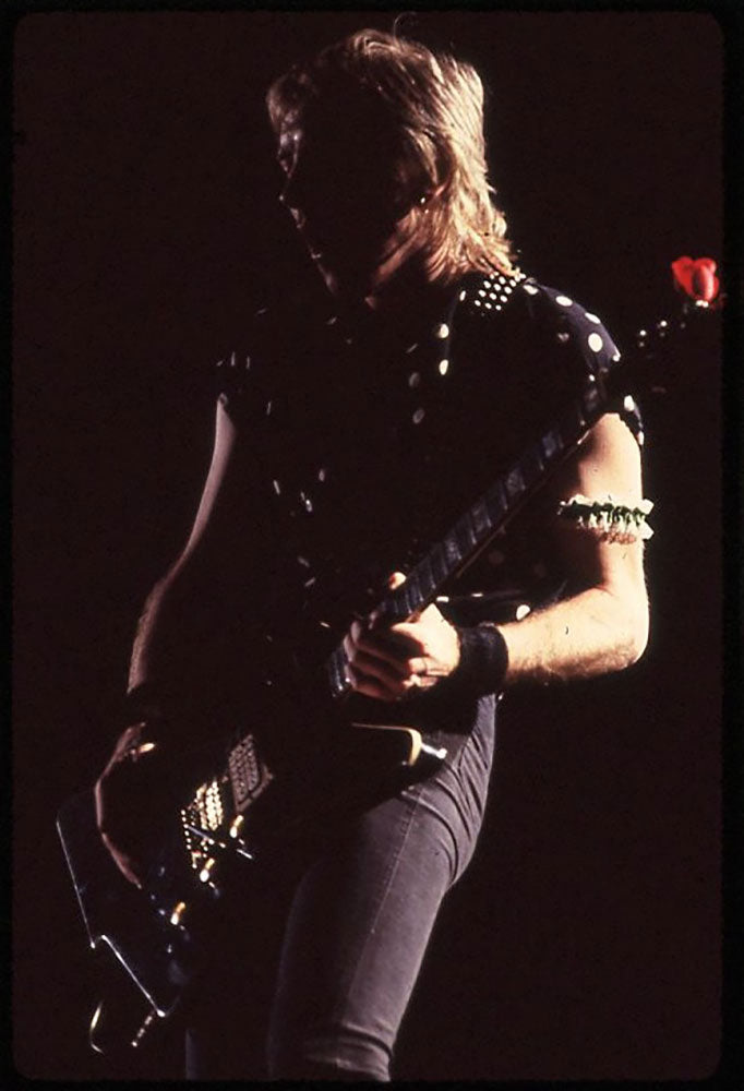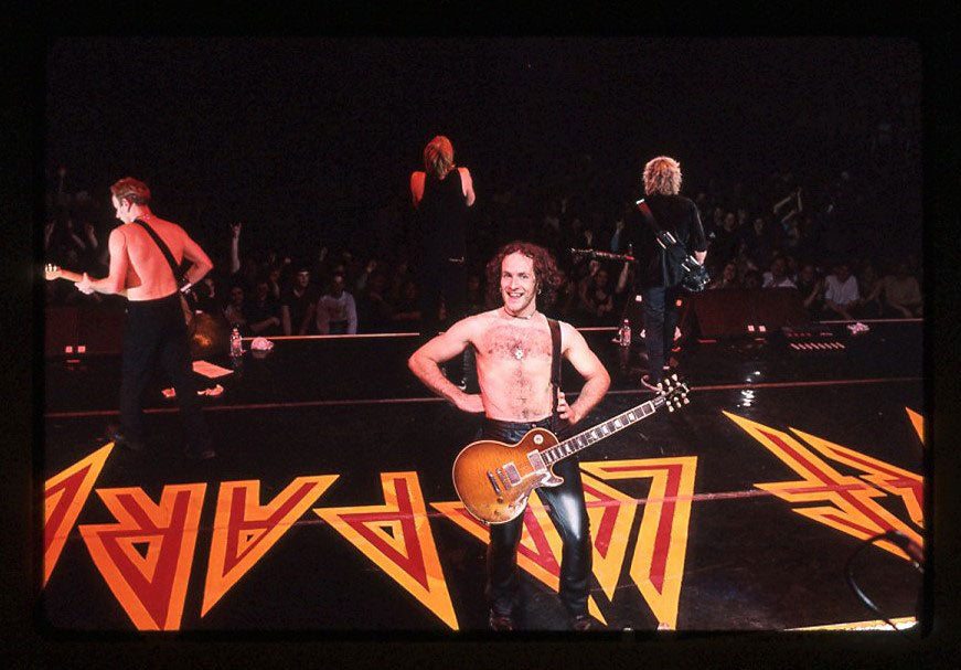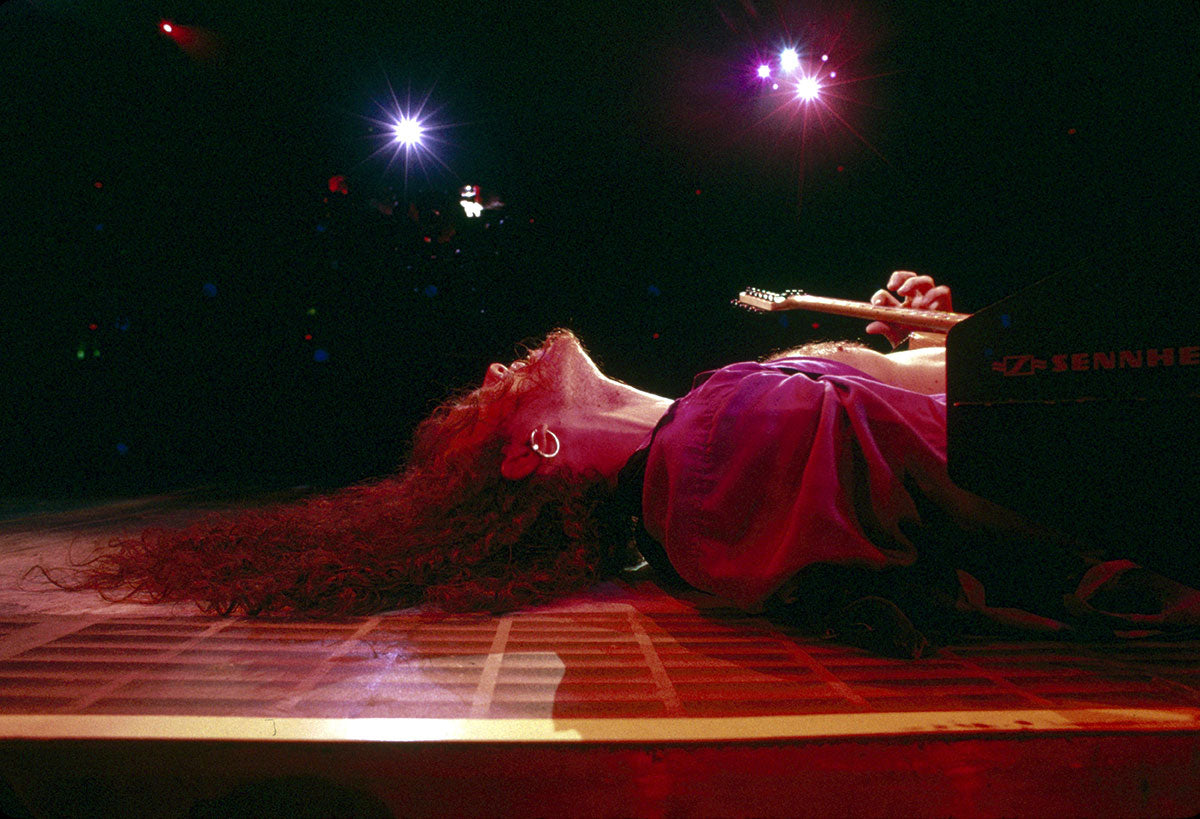 Viv laying it all out there, playing on the Adrenalize stage floor, 1992. Photo: Ross Halfin. From the Collection of Def Leppard.