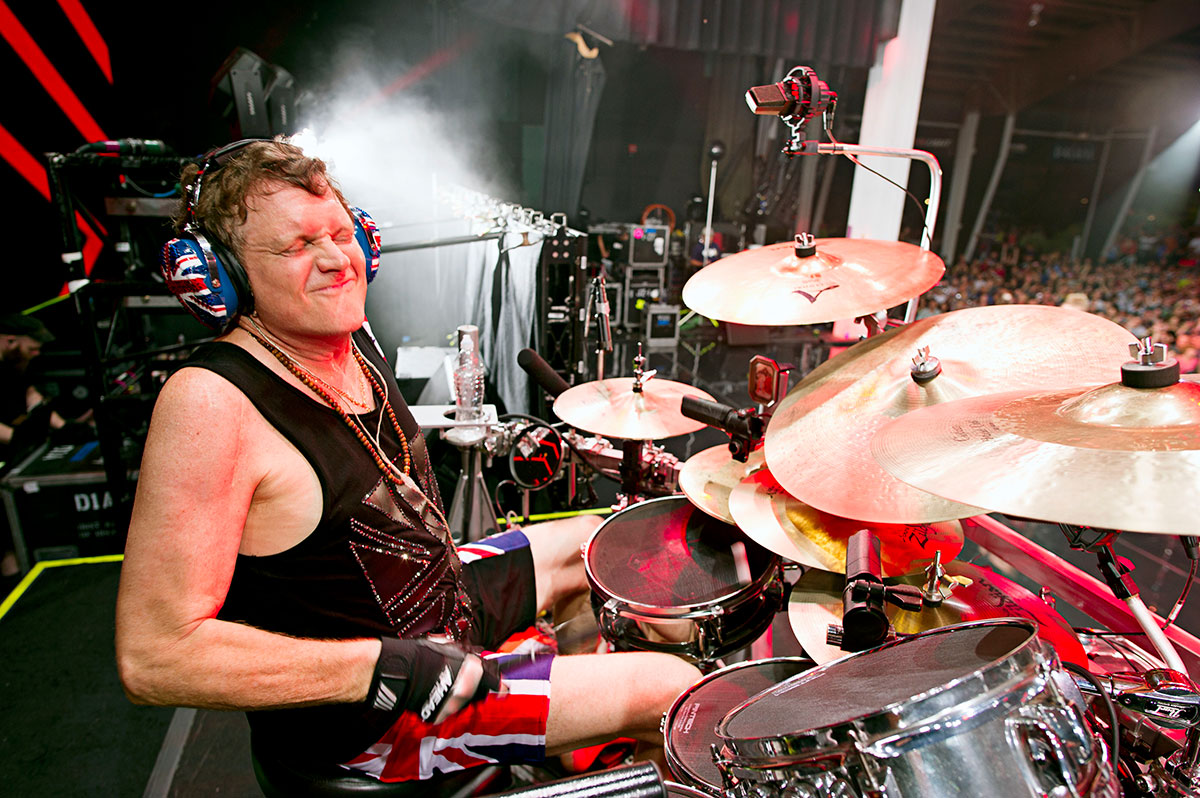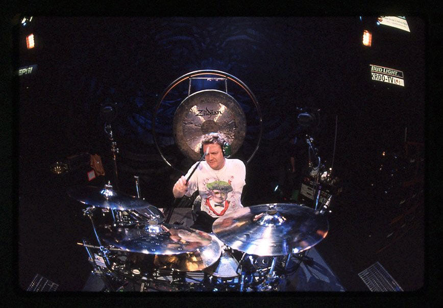 Viv is lord of the stage in this drummer's-eye-view photo, Euphoria Tour circa 2000. Photo: Ross Halfin. From the Collection of Def Leppard.