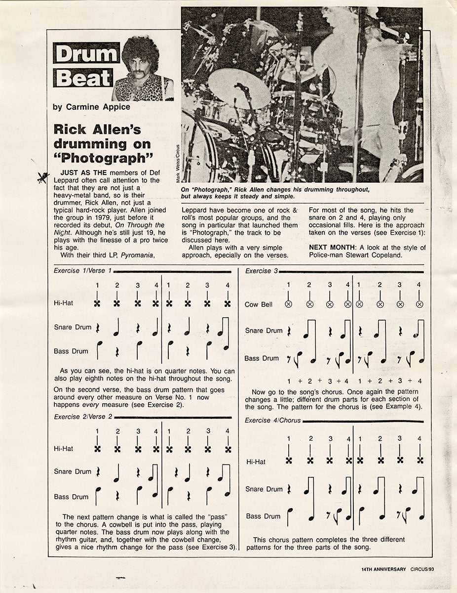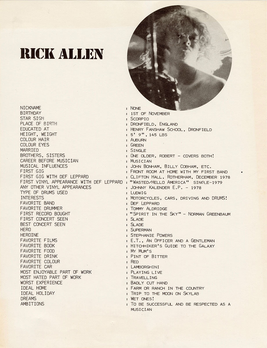 Press kit in support of Hysteria, including a page on Rick's new drum kit. From the Collection of Joe Elliott.