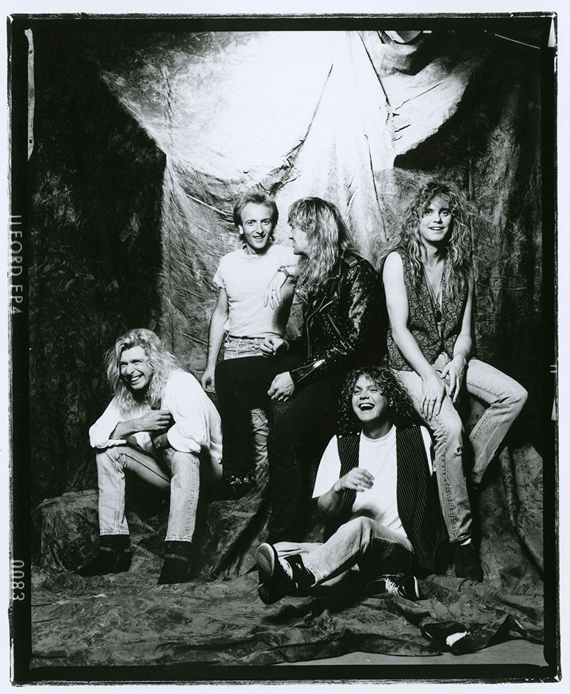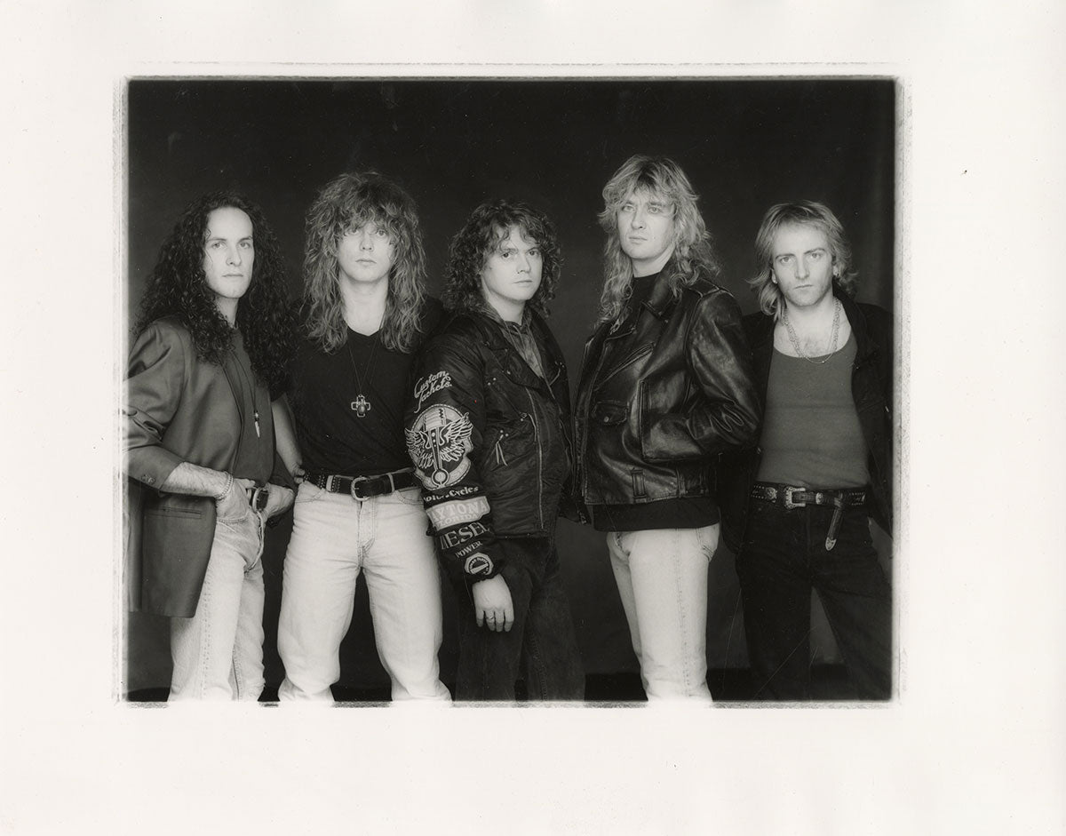 In 1992, Def Leppard unveiled a new lineup, now with heavy-hitter Vivian Campbell of Dio fame. This Adrenalize publicity portrait for Mercury Records is one of the first to introduce Viv. Photo: Ross Halfin. From the Collection of Def Leppard.