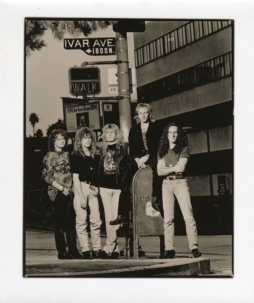 Ross Halfin captures the band in the heart of Hollywood at 1800 Ivar Ave, not far from Capitol Records. It was a sunny December day in Los Angeles, 1992, as Rick, Sav, Joe, Phil, and Viv prepared for an Adrenalize performance at the Forum. Photo: Ross Halfin. From the Collection of Def Leppard.