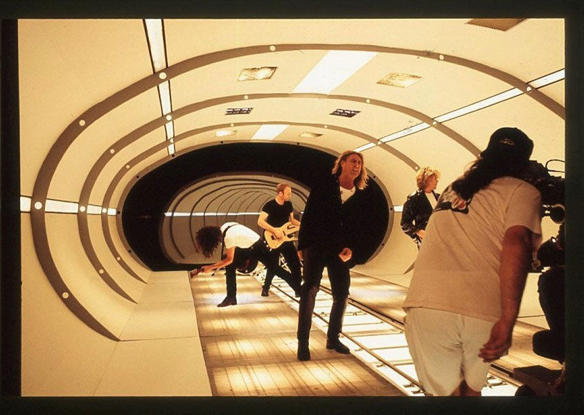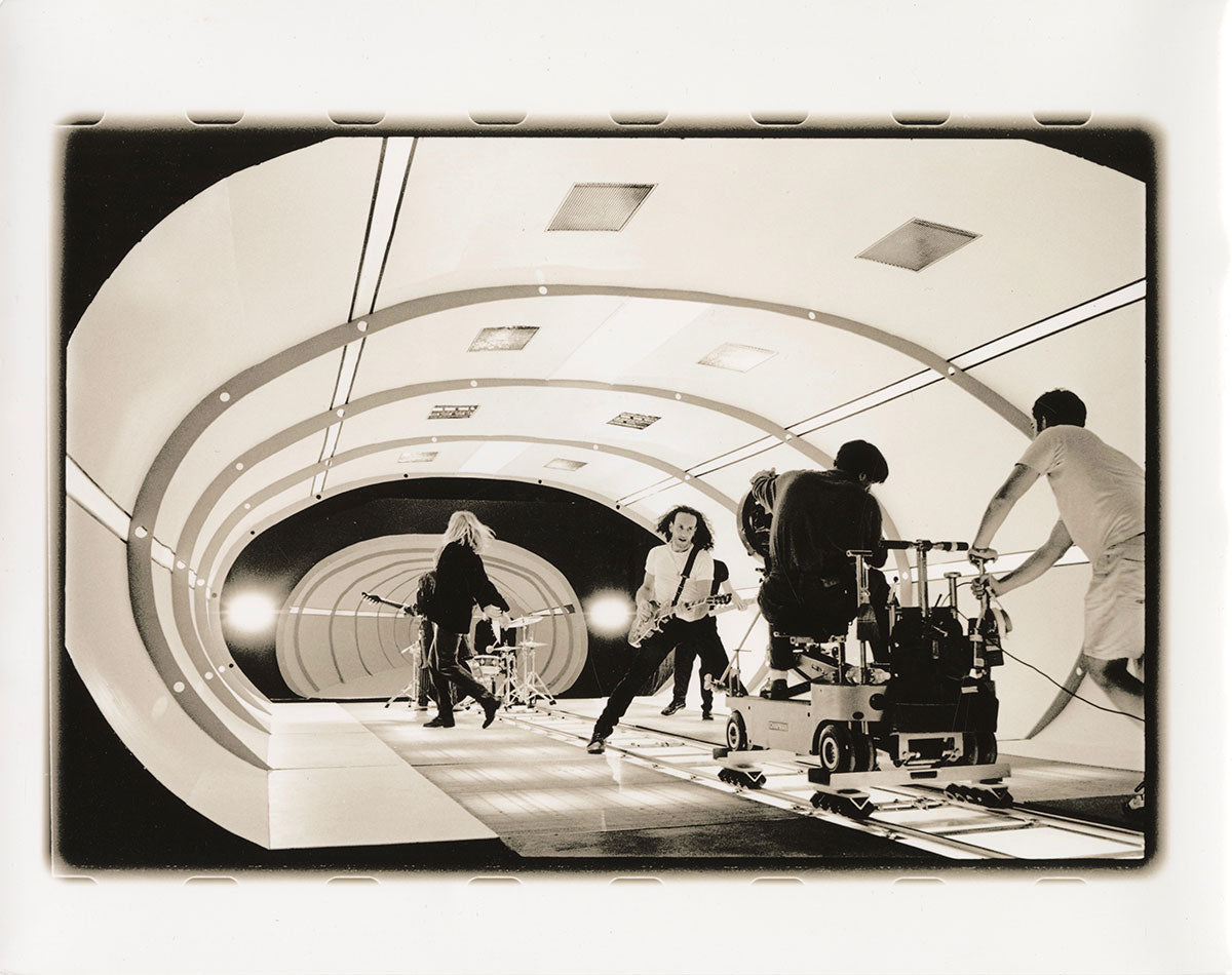 A behind-the-scenes look at how a track-mounted camera dolly was used to get dynamic shots for the Slang video in 1996 - this one has Viv as the focus. Photo: Ross Halfin. From the Collection of Def Leppard.