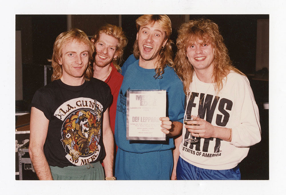 Phil, Steve, Joe, and Sav celebrate their Metal Edge Magazine 1988 Readers' Choice Award. From the Collection of Def Leppard.