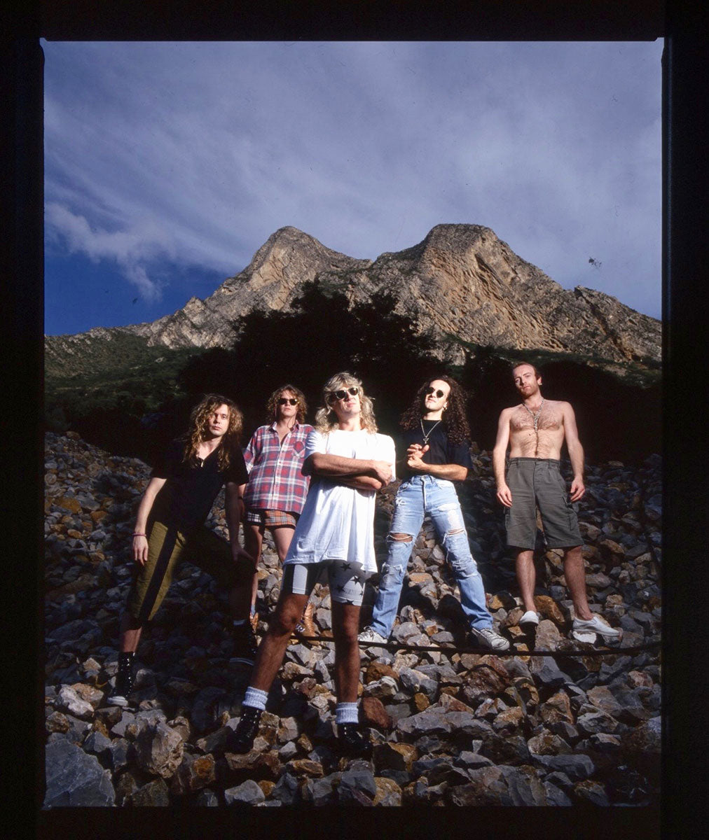 Def Leppard makes a mountainside stop during the Adrenalize Tour, 1992. Sav, Rick, Joe, Viv, and Phil enjoyed the scenery and a more relaxed fashion aesthetic during this worldwide 17-month touring adventure. From the Collection of Def Leppard.