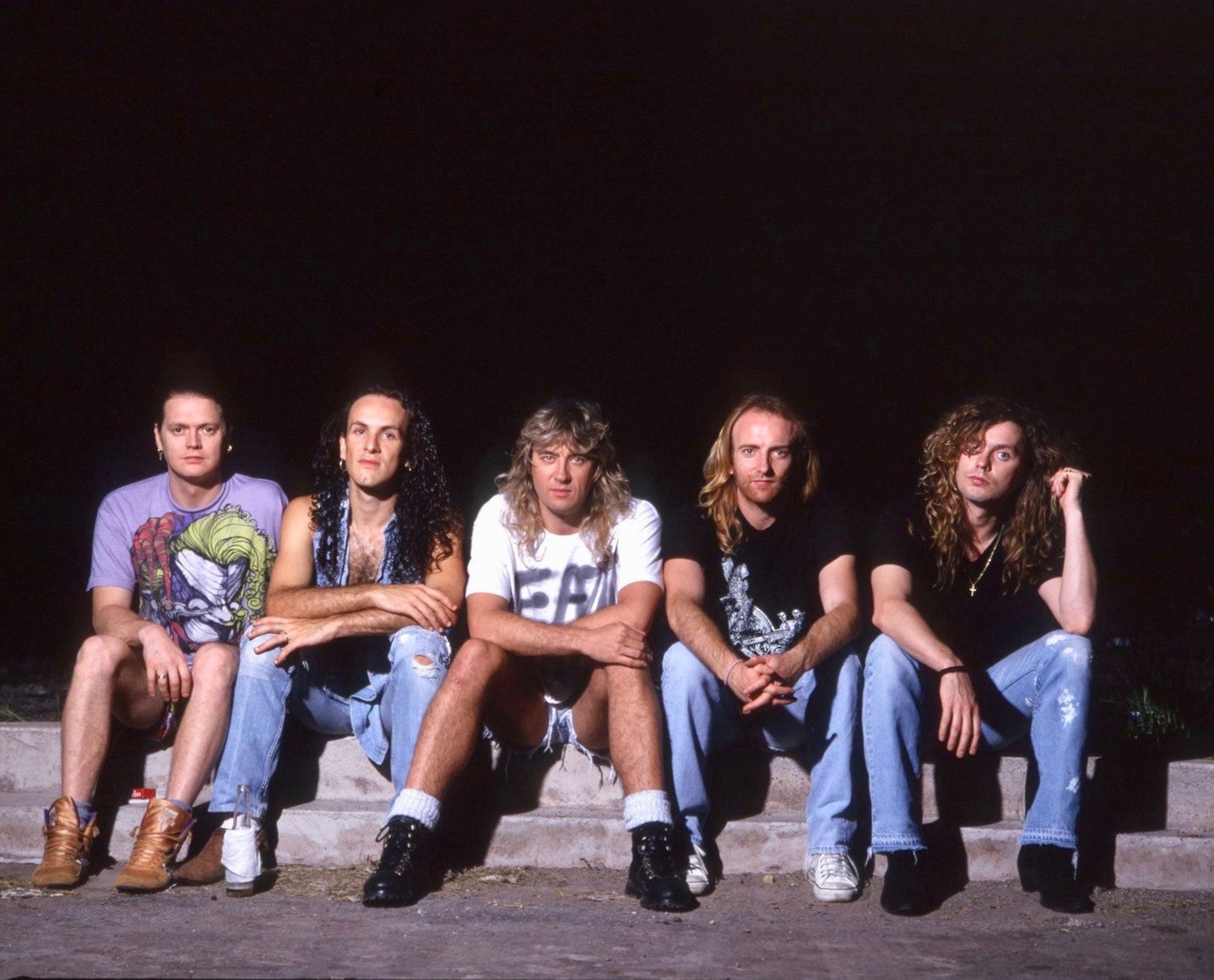Joe, Rick, Phil, Sav, and Steve catch a breath backstage post-show on the Hysteria Tour, circa 1988. From the Collection of Def Leppard.