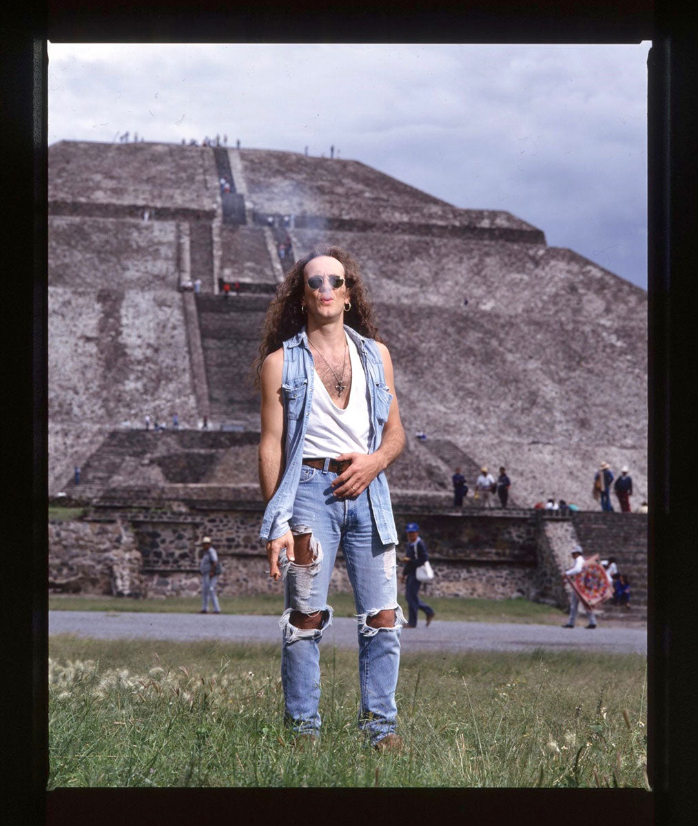 Viv takes a much-deserved break in front of an ancient Teotihuacan pyramid at the close of the Adrenalize Tour, September 1993. From the Collection of Def Leppard.