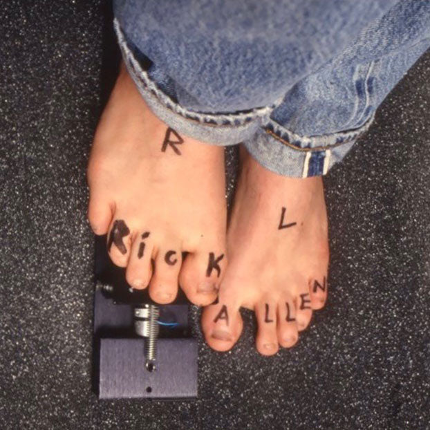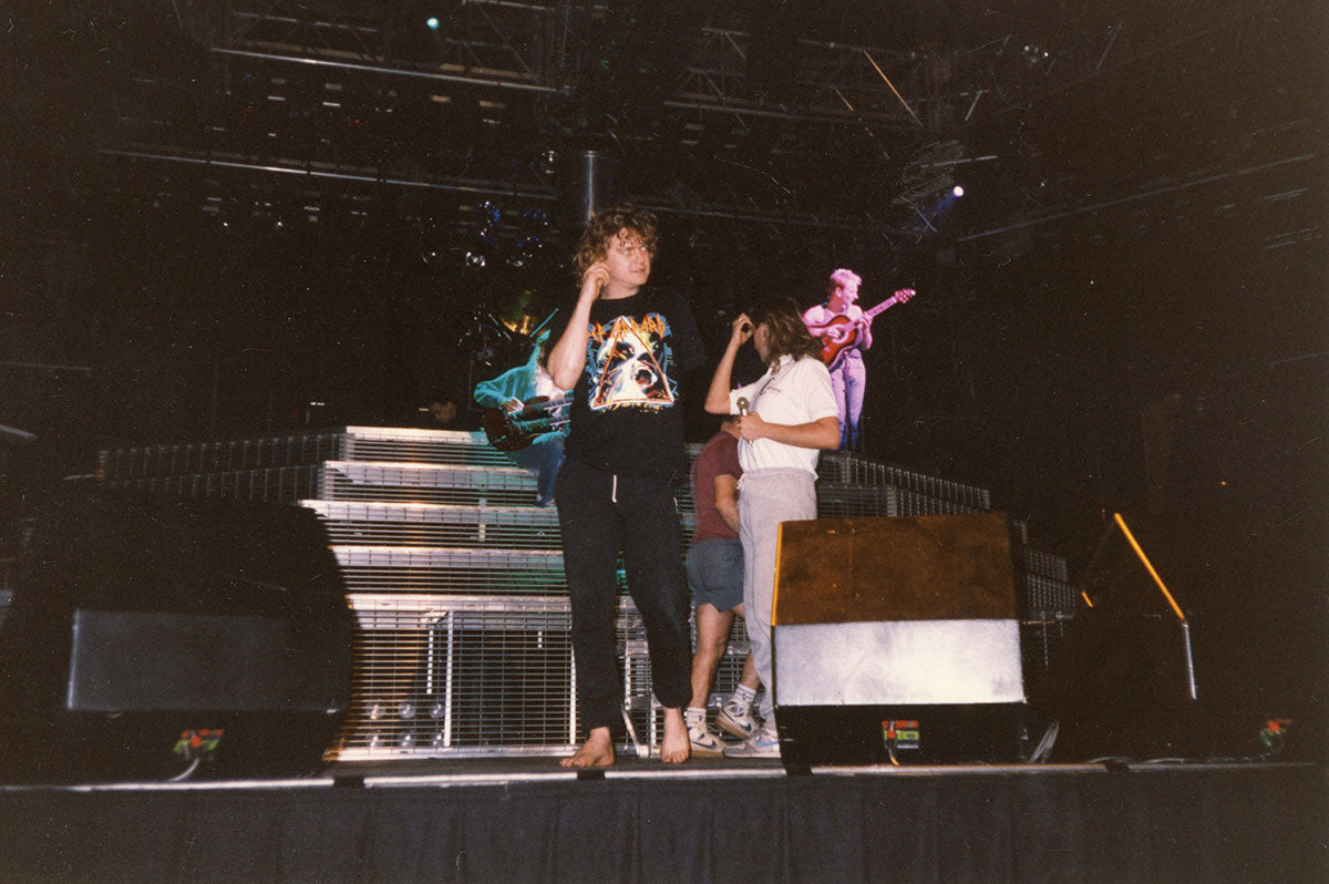 Sound check on the Hysteria Tour, circa 1988. Rick stands barefoot with Joe, Phil, and Steve warming up in the background. In-the-round was the preferred set up for this tour, but during the summer of 1988, playing larger amphitheaters called for a half-stage configuration with the drums on higher risers. Courtesy of the Lorelei Shellist Private Collection.