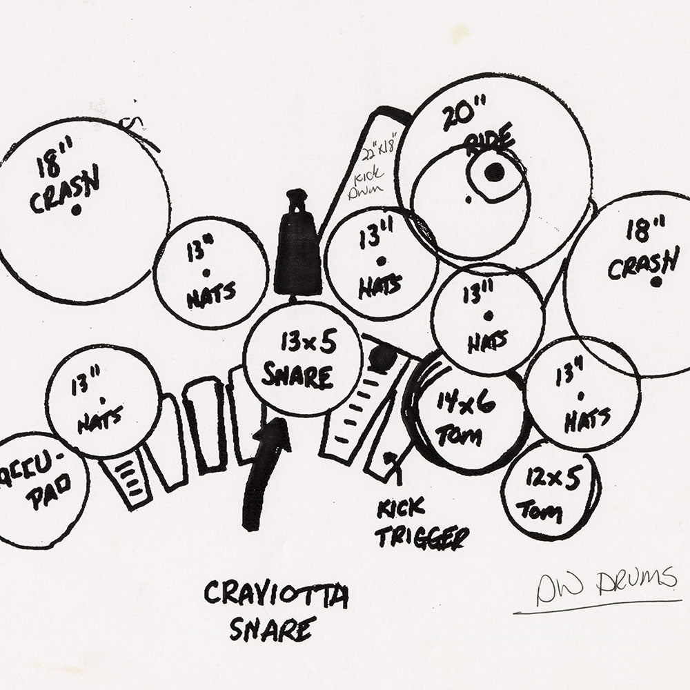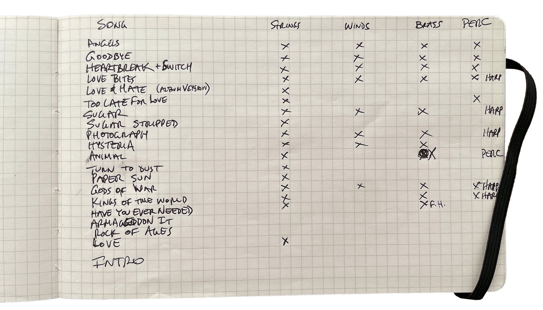 Arranger Eric Gorfain's Drastic Symphonies song chart. Eric explained, "With so many songs in the mix, I had to keep a chart of what instruments played on what song to make sure we could plan the recording sessions at Abbey Road accordingly." Photo: Eric Gorfain.