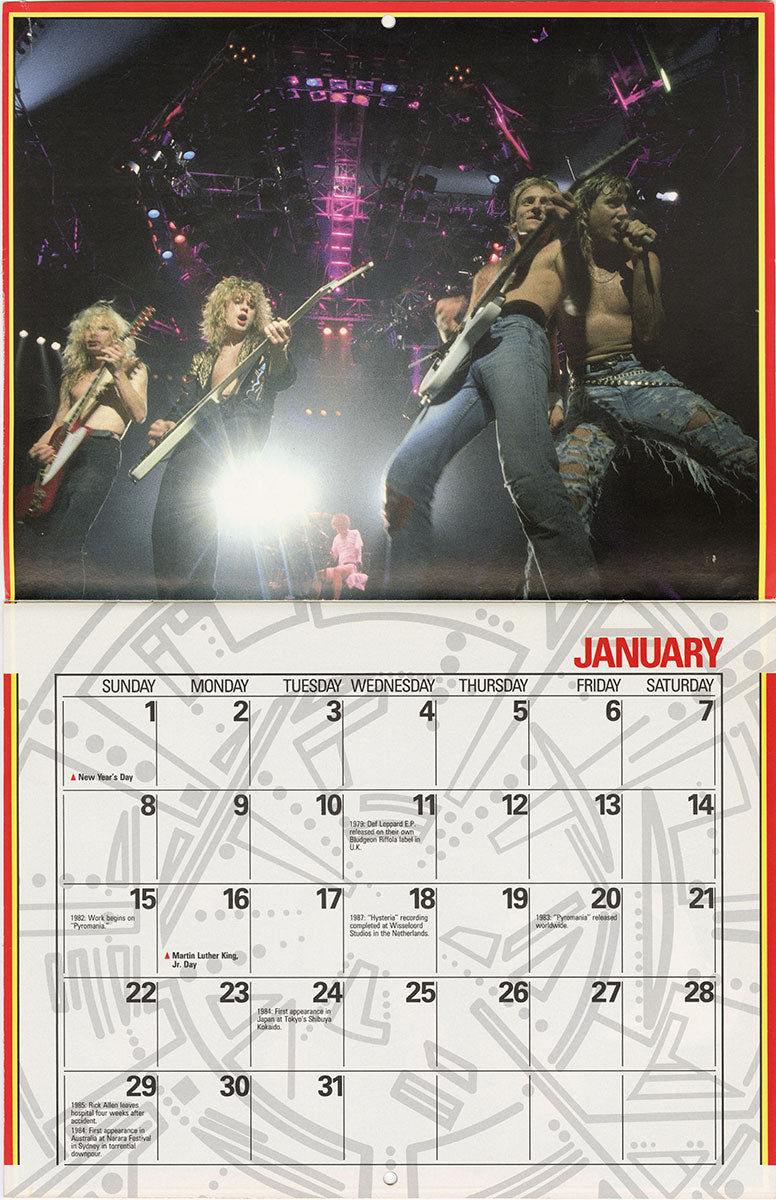 January's entry in the 1989 Def Leppard wall calendar features the band performing on the Hysteria Tour, in-the-round configuration. Photo by Ross Halfin. From the Collection of Def Leppard.