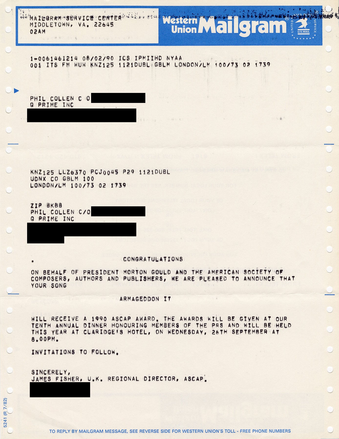Western Union Mailgram addressed to Phil Collen notifying him that Hysteria's "Armageddon It" would receive a 1990 ASCAP Award. From the Collection of Def Leppard.