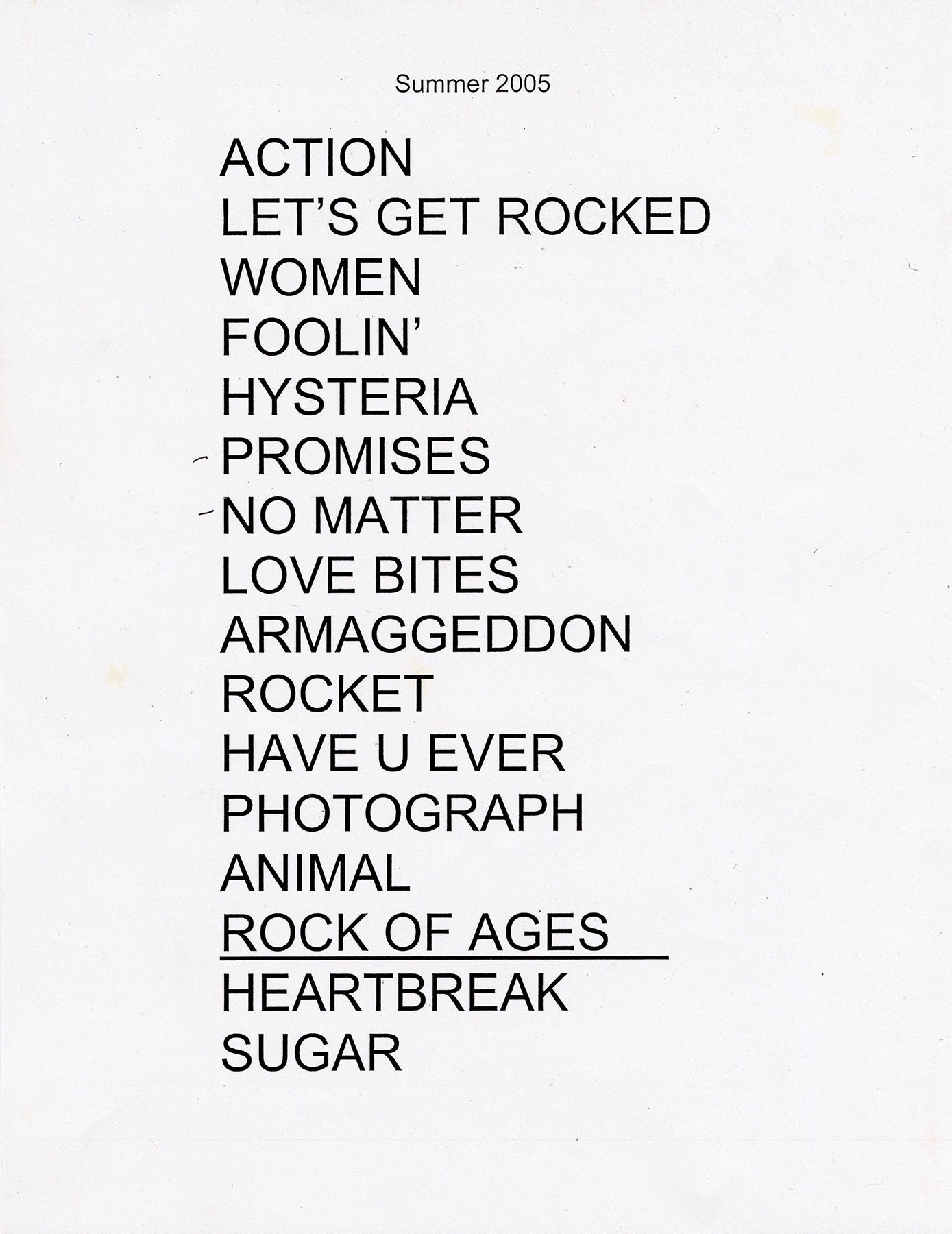 Setlist for the summer leg of the Rock of Ages Tour, 2005. From the Collection of Def Leppard.