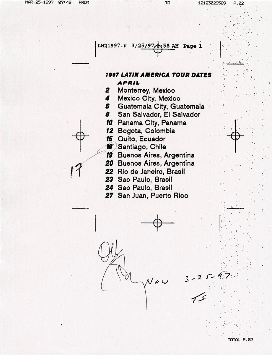 In March of 1997, the South American Slang Tour dates were being prepared for printing. This faxed correspondence includes updates and corrections. From the Collection of Def Leppard.