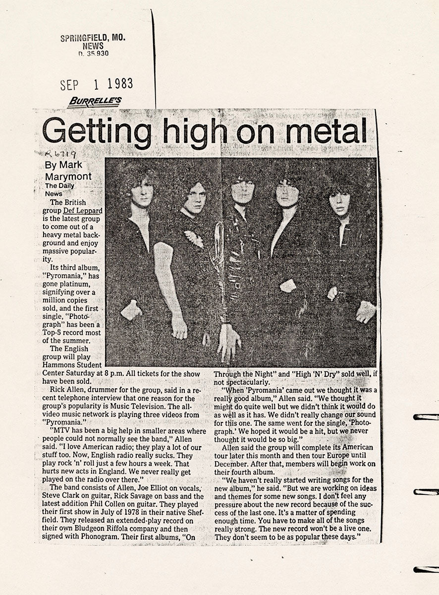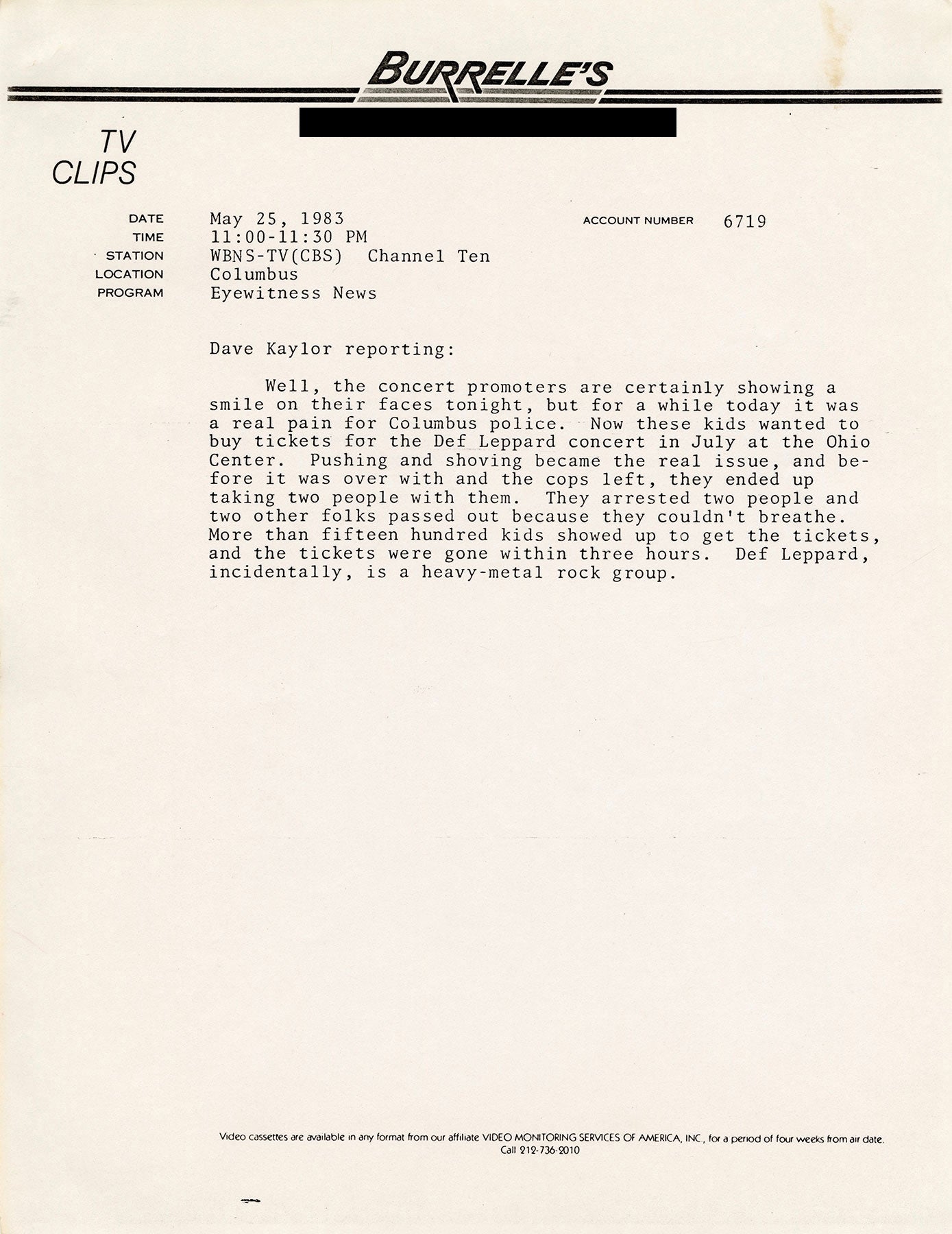 Burrelle's transcript from WBNS-TV, Eyewitness News, Columbus, broadcast date 25 May 1983. Journalist Dave Keller reported on the mad rush to buy tickets for an upcoming Pyromania Tour stop at the Greater Columbus Convention Center. From the Collection of Def Leppard.