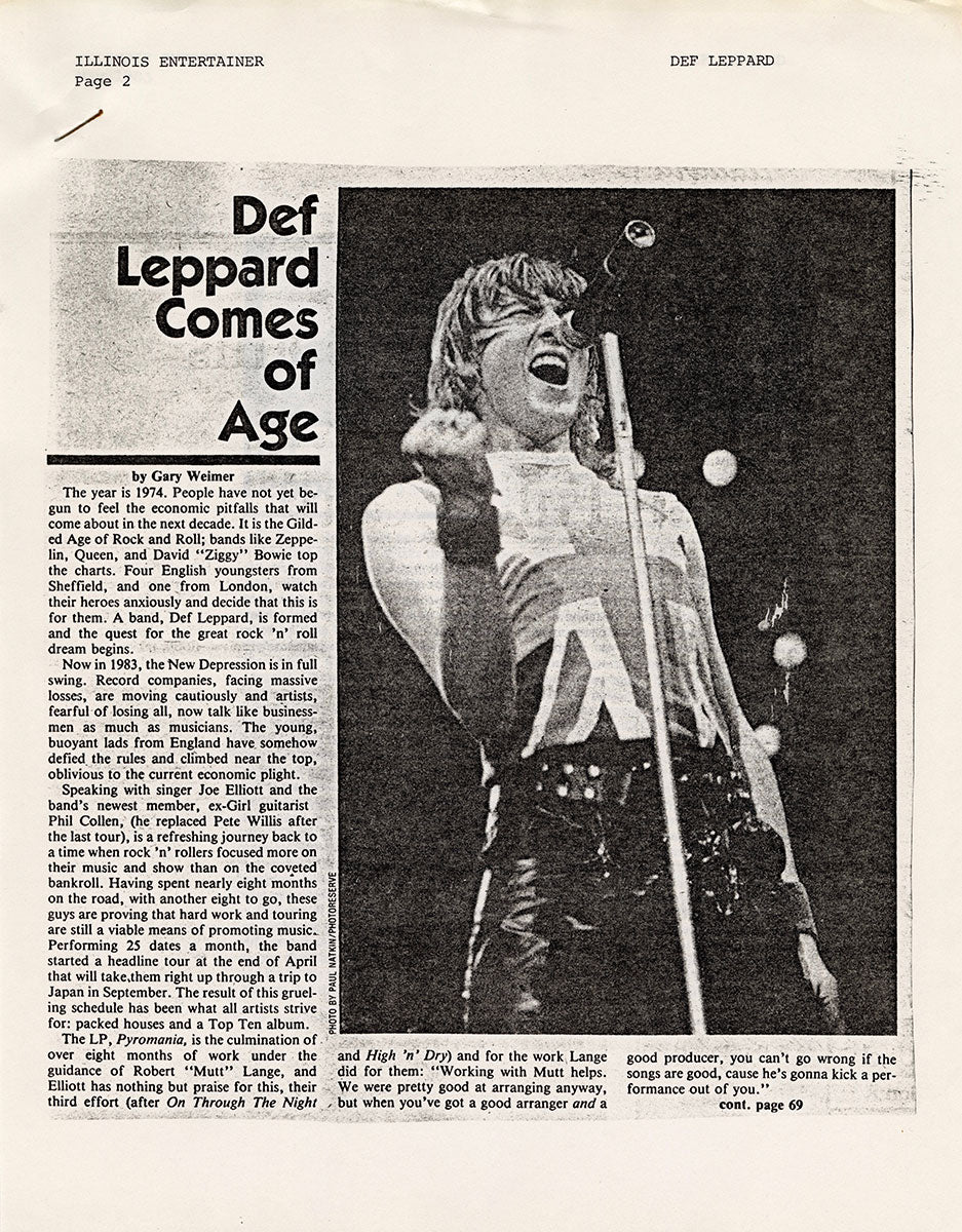 Steve Clark kept this clipping from a cover feature found in issue 208 of Kerrang!, October 1988. The article included Ross Halfin photos from a Hysteria Tour performance, in-the-round configuration. Courtesy of the Lorelei Shellist Private Collection.