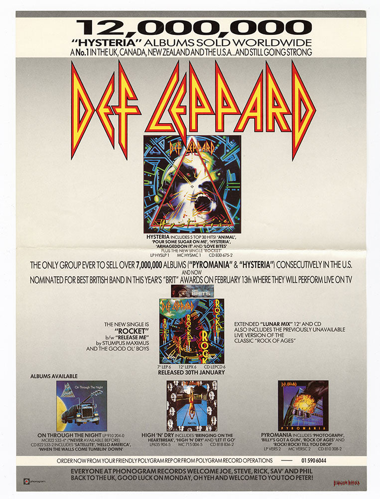Bludgeon Riffola promotional poster celebrating the success of Hysteria, and Def Leppard's nomination and upcoming performance on the Brit Awards, February 1989. From the Collection of Def Leppard.